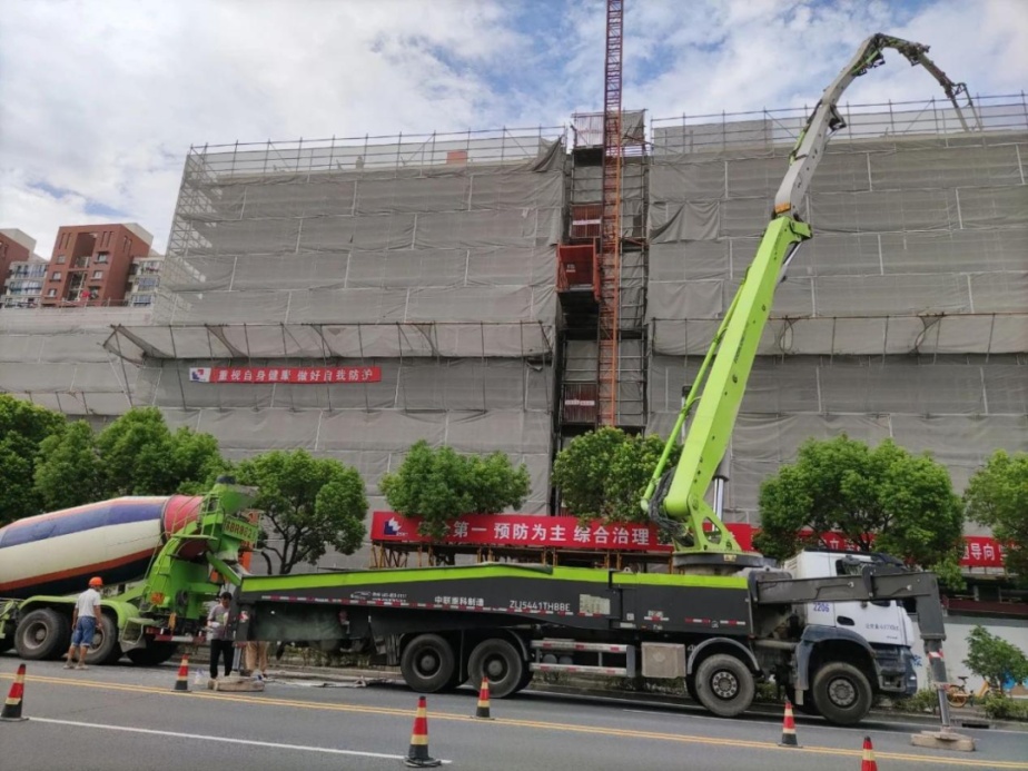 在航头镇的G4/G5项目建设现场,混凝土天泵车伸出长臂,将一车车混凝土浇筑到承台内,现场一派忙碌景象。
