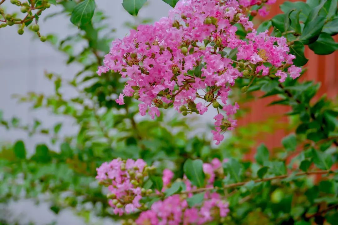 紫薇把一冬积蓄的浓艳,泼泼洒洒地绽放出来,从盛夏一直怒放到中秋,在这个炎热的季节奏响最华美的乐章。在这绿肥红瘦的季节里,紫薇花使浓重绿色里多了灿烂的色彩,使沉闷酷热中多了些许诗情画意,让“苦夏”不苦。
