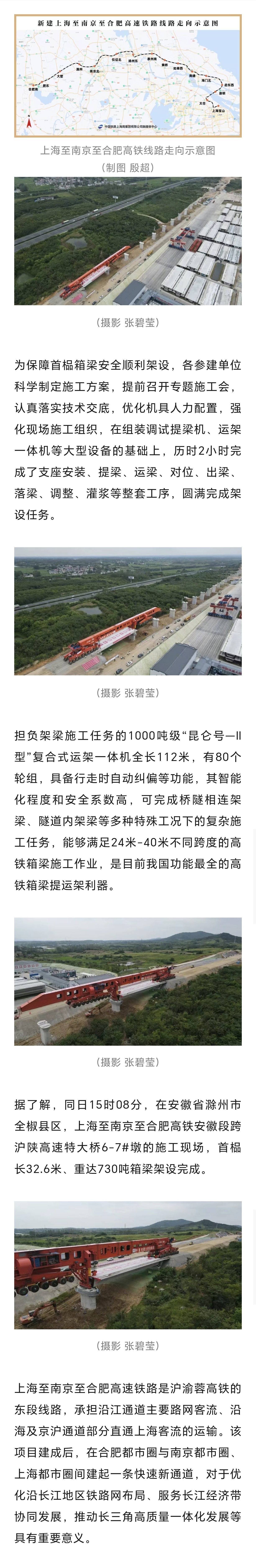 中铁上海局集团有限公司介绍,8月27日13时30分,在合肥市肥东县包公镇施工现场,随着“昆仑号—Ⅱ型”运架一体机将长40.6米、宽12.6米、高3.25米,重930吨的箱梁稳稳地架设在南鹰庄特大桥桥台—18号桥墩上,标志着上海至南京至合肥高铁首榀箱梁成功架设,项目建设施工进入全线架梁阶段。详见↓