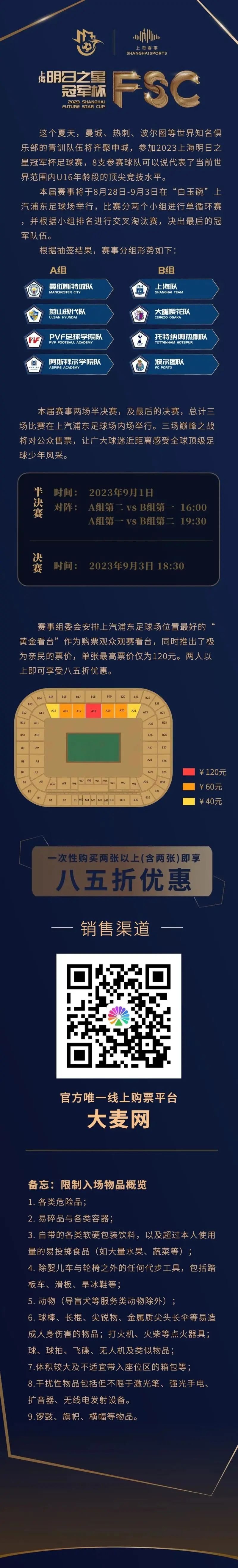 8月28日2023上海明日之星冠军杯足球赛将在上汽浦东足球场打响,英超曼城和托特纳姆热刺、葡超波尔图、日本大阪樱花、韩国蔚山现代队、卡塔尔阿斯拜尔学院、PVF足球学院队和上海队等8支球队,将展现世界足球U16年龄段的顶级竞技水平。