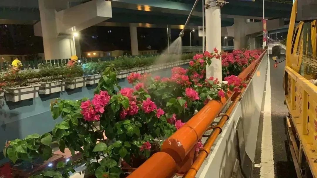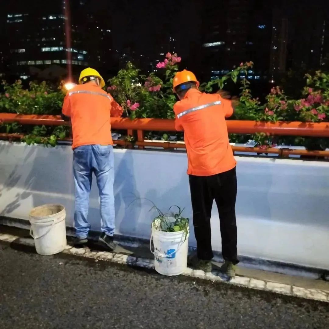 自七月初开始,三角梅日常养护单位利用十一次夜间高架养护封道段,冒酷暑、战高温,在一个月内完成了高架三角梅的摆放工作。