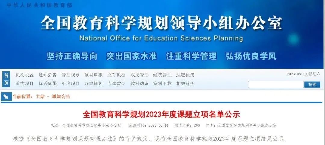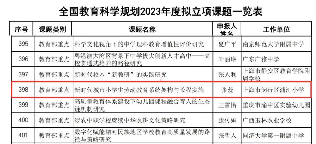 近日,全国教育科学规划2023年度立项课题公示。 2023年,在各省(区、市)、香港特别行政区、澳门特别行政区认真遴选推荐的基础上,教育部组织了资格审查、专家网络评审和专家会议评审,共确定立项课题524项,其中国家重大课题11项、国家重点课题9项、国家一般课题262项、国家青年课题58项、西部项目课题10项、教育部重点课题111项、教育部青年课题54项、教育部专项课题9项。 在发布的立项课题名单中,上海市有3所中小学申报的课题入选。其中,上海市闵行区浦汇小学申报的《新时代城市小学生劳动教育系统架构与长程实施》立项教育部重点课题。