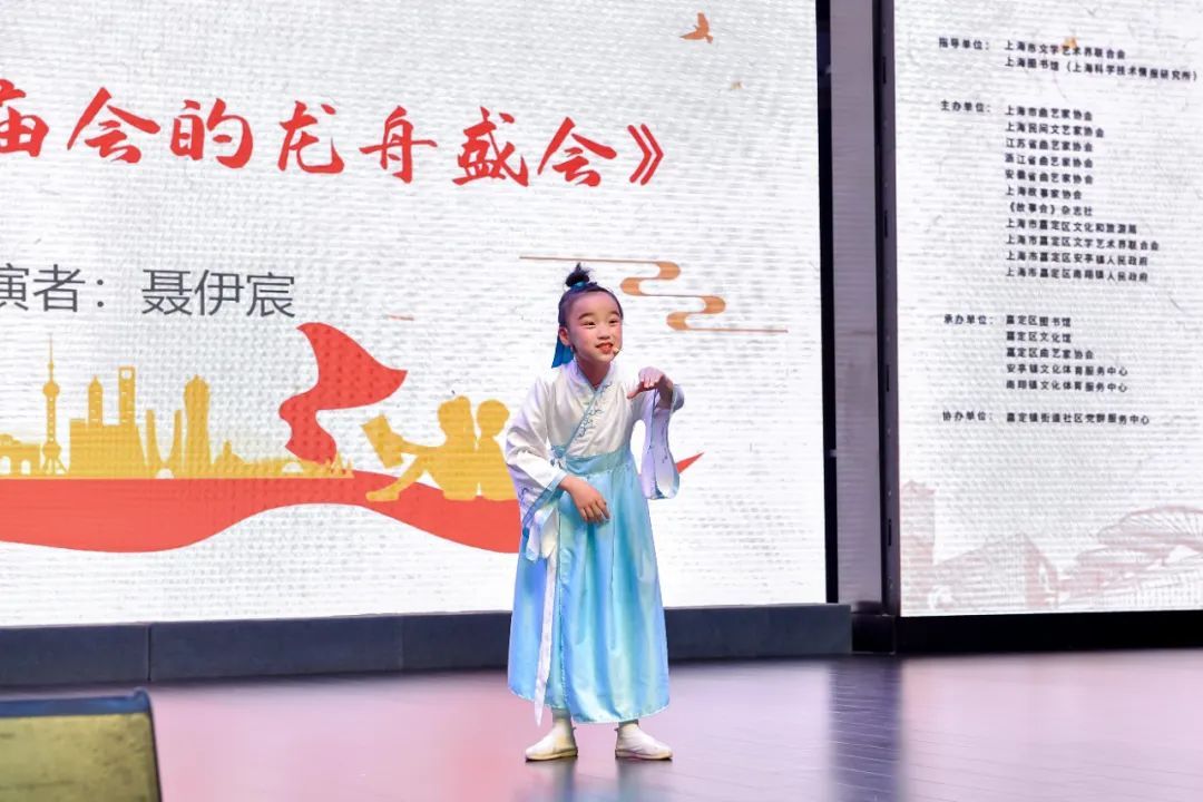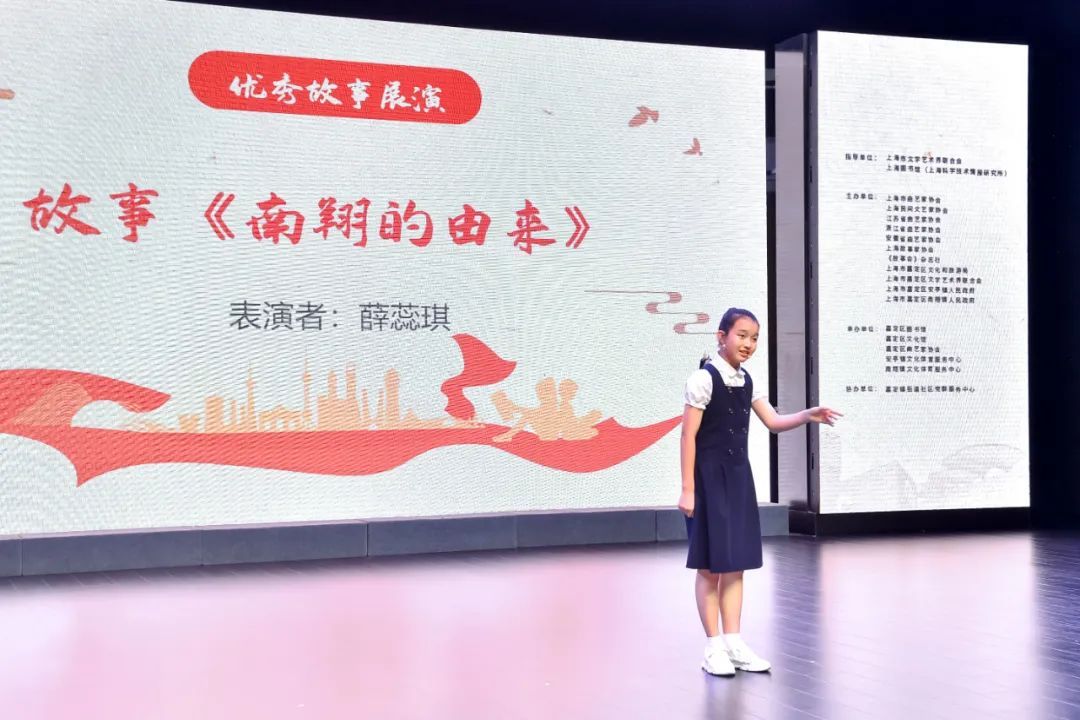 嘉定小囡薛蕊琪自幼学习讲故事,舞台经验丰富,此次参赛,她选择了入选第十一批嘉定区非物质文化遗产名录的“白鹤南翔传说”。“在一千五百多年前梁武帝立国的时候,南翔还只是一个山清水秀的小村庄……”扎实的台词功底、精准的节奏气息,薛蕊琪一亮相,便让台下观众眼前一亮。