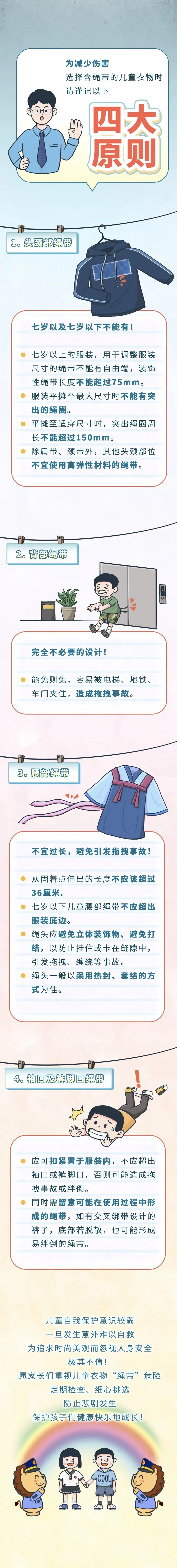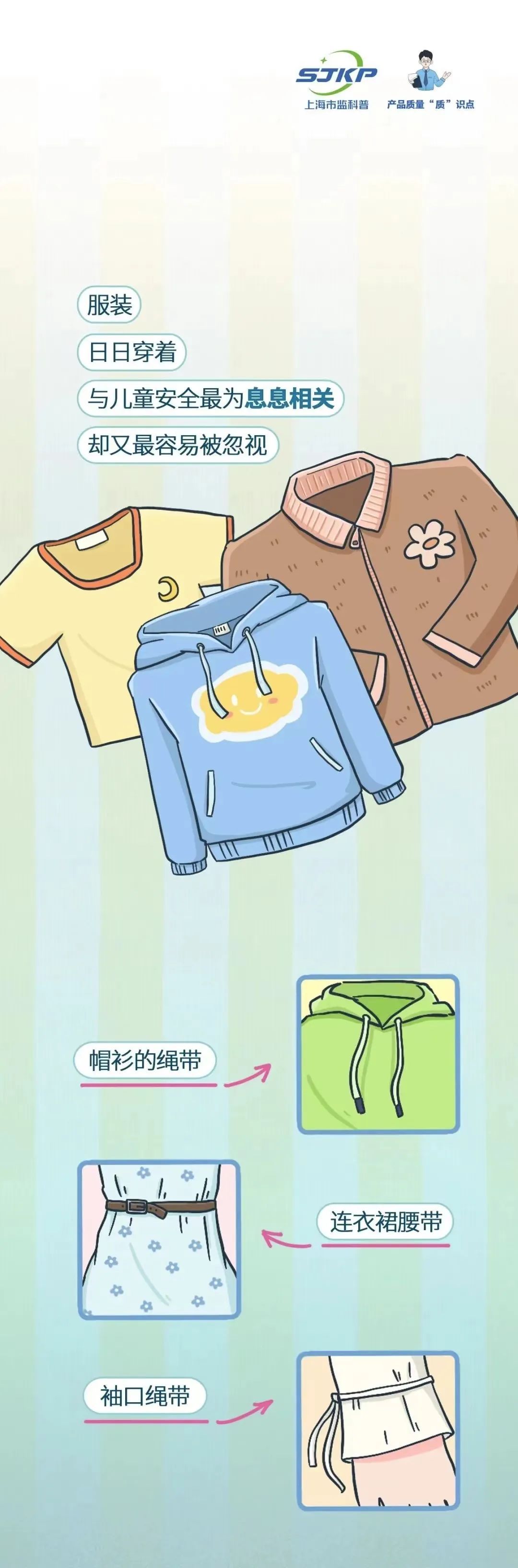 市市场监管局介绍,服装日日穿着,与儿童安全息息相关,服装上很多绳带设计都可能危害儿童的安全。为减少安全隐患,挑选儿童衣物时可以注意这些原则。详见