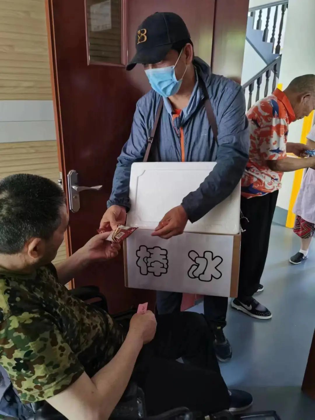 “卖棒冰了!红豆棒冰、盐水棒冰!谁要买棒冰!”下午2点半,一声声叫卖声打破了东平养老院的宁静。一个中年男子脖子上挂着一个棒冰箱子,热情地“招呼”着大家。老人们看到他觉得新鲜极了,一边打趣,一边拿出手中刚发下来的“钱票”问他“买”棒冰吃。