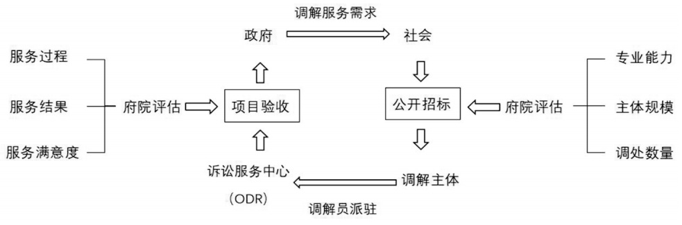 第二,ODR调解主体从“请进来”到“市场化”。政府采购作为政府向社会购买公共服务的常用方式。从2002年第一部政府采购法颁布之日算起,该采购制度已在社会主义市场经济中运行了将近二十个年头,形成了严密的财政监管、资质审核、专家评审、项目验收体系,在实现某一公益目标上具有公开性、透明性、可控性。诉前调解的目的是法院为了实现政府及社会共同认可的社会公益目标,通过运作社会性资源及治理型资源为公众提供纠纷解决的服务,当然属于政府采购的范畴。诉前调解作为法院ODR建设的一部分,自建立之初目标就非常明确,即缓解当下法院的“诉讼爆炸”“案多人少”“审理迟延”的现实问题,目的性、指向性、效果性均十分明显,政府采购服务这种模式明显契合这一特征。政府购买服务实现了“政府+社会+法院”的工作任务分解,同时也保障了社会组织较为稳定的经费来源。具体操作中,政府可以在网络平台上向全社会发出政府采购招投标公告,表明其在一定招标限额之内对调解主体的选聘要求,如要求调解主体具有某一方面的专业能力、每一年度需要调处多少纠纷数量等等。社会各个主体在看到公告后,可以结合自身实际情况对采购项目投标,政府组织由政府内部人员、法院、行业专家组成的联合项目评审组对投标人的资质、能力进行潜在评估,最终结合其投标报价确定最佳的项目中标人。