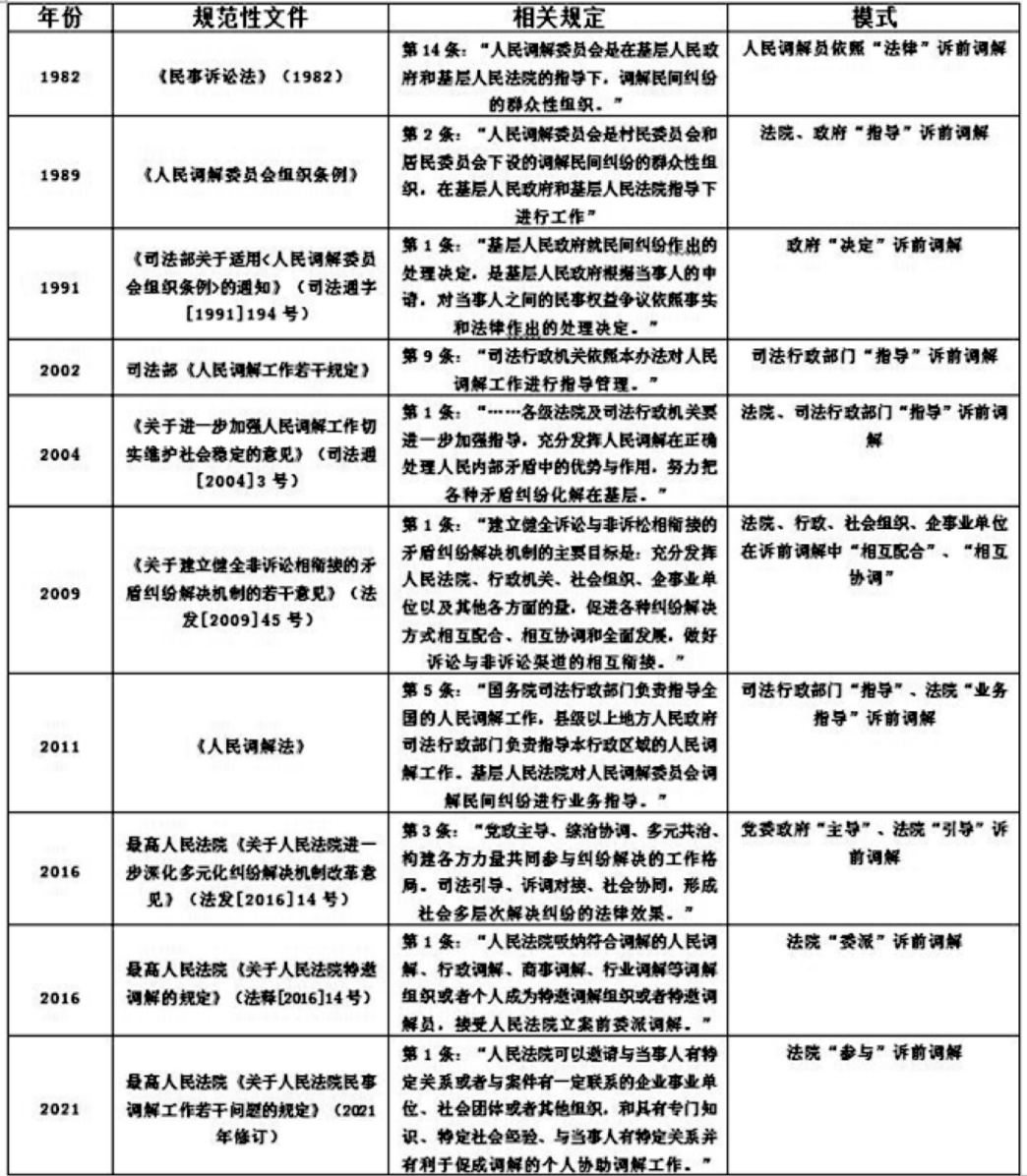 从1982年民事诉讼法中“群众性组织”的措辞可以看出,人民调解在传统社会的纠纷化解中具有重要地位。2009年之后,诉前解纷的模式开始趋于稳定。首先,法院与政府在诉前解纷中扮演着不同角色。政府“主导”“指导”诉前调解工作,法院“引导”“参与”“业务指导”诉前调解工作的进行。其次,诉前解纷呈现多元化。社会组织、企社会事业单位、行政机关等各方面的力量进行整合形成诉前解纷的合力。最后,“委派调解”成为实践中的主要管理模式,为法院附设的诉前调解提供了现实的操作路径(表1)。