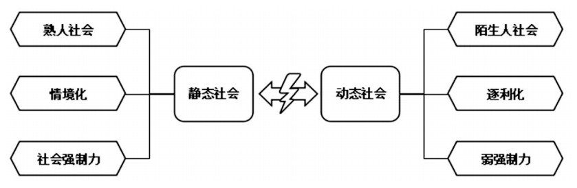 第三,现代社会的纠纷化解更加注重利益而非情感,具有政府主导的市场化前提条件。当前我国的社会关系、社会生产力以及社会各个要素之间都在发生着深刻的变革,互联网使得商品交易、货物运输、生活服务等等不再局限于“熟人社会”,陌生人与陌生人之间通过互联网接触、洽谈、达成协议,传统静态社会中的“熟人关系”“情境化交易”已逐渐面临着解构,动态社会中的“陌生人关系”“逐利化交易”的时代正在形成。在静态社会中,人民调解还可以借助小范围的社会韧性来发挥督促调解、履行调解协议的作用。然而,在动态社会中,因为社会关系的各个主体之间可能原本并不相识,甚至没有见过一面,在这种情形下,各种依托社会关系、情景化交涉来获得调处效果的方式存疑。当事人之间进行磋商、沟通、和解的目的是达成利益交换而非情感认同,商事纠纷化解的仲裁方式,实际上就是陌生人社会的调解的典型。在纠纷解决的过程当中,纠纷的信息、评价以及相应的规则都需要双方当事人以及调解员有意识地策划,诉前调解只是为当事人的解决纠纷提供场地,当事人双方是在“法律的影响下”进行交易。这一现象,已与传统人民调解中的“教化”功能大相径庭(图2)。