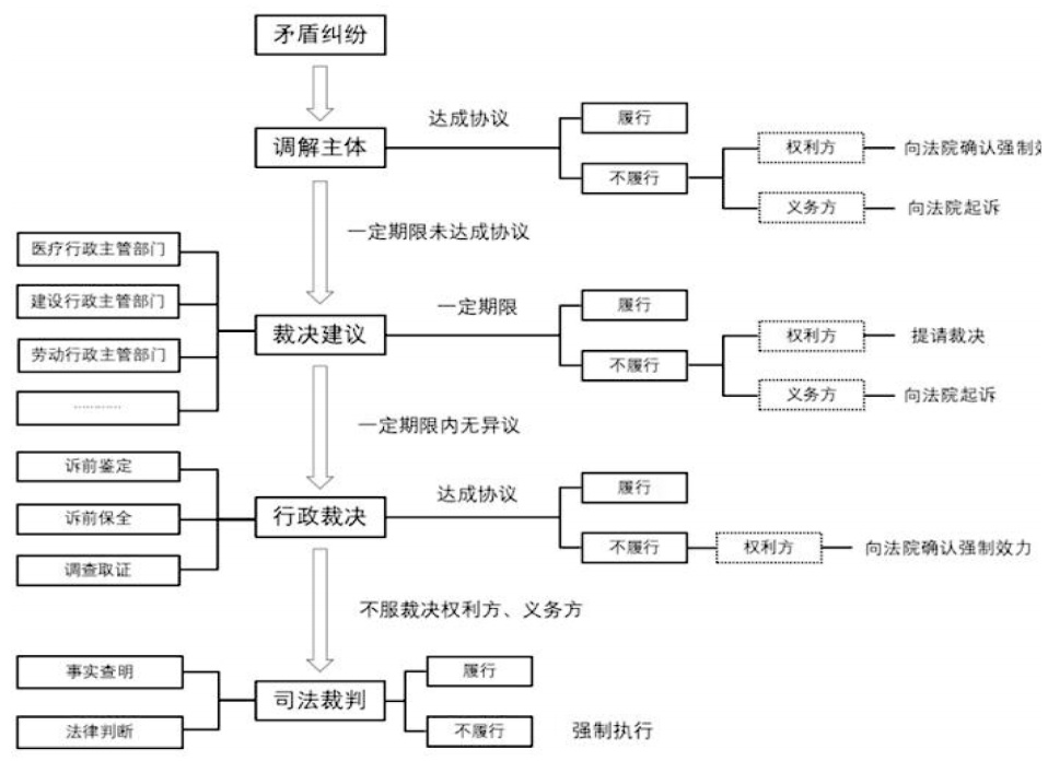 第二,“调”“裁”衔接。在调解过程中,调解主体发现纠纷不能调解或无法调解时,应当向相应的行政管理部门提请裁决建议,在诉前调解期限内,若双方当事人均未对裁决建议提出异议,行政管理部门可以依照裁决建议作出行政裁决,经当事人申请,人民法院可赋予其强制执行力。
