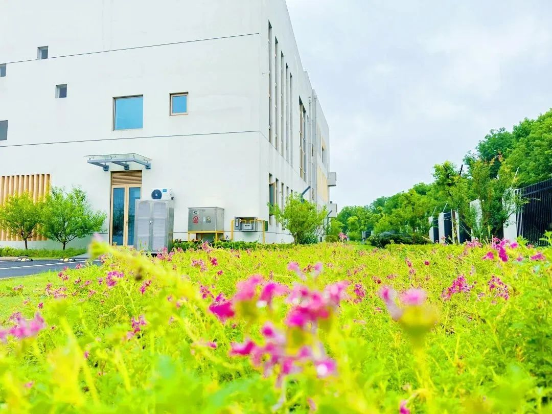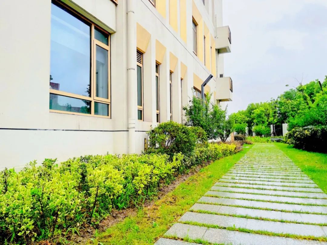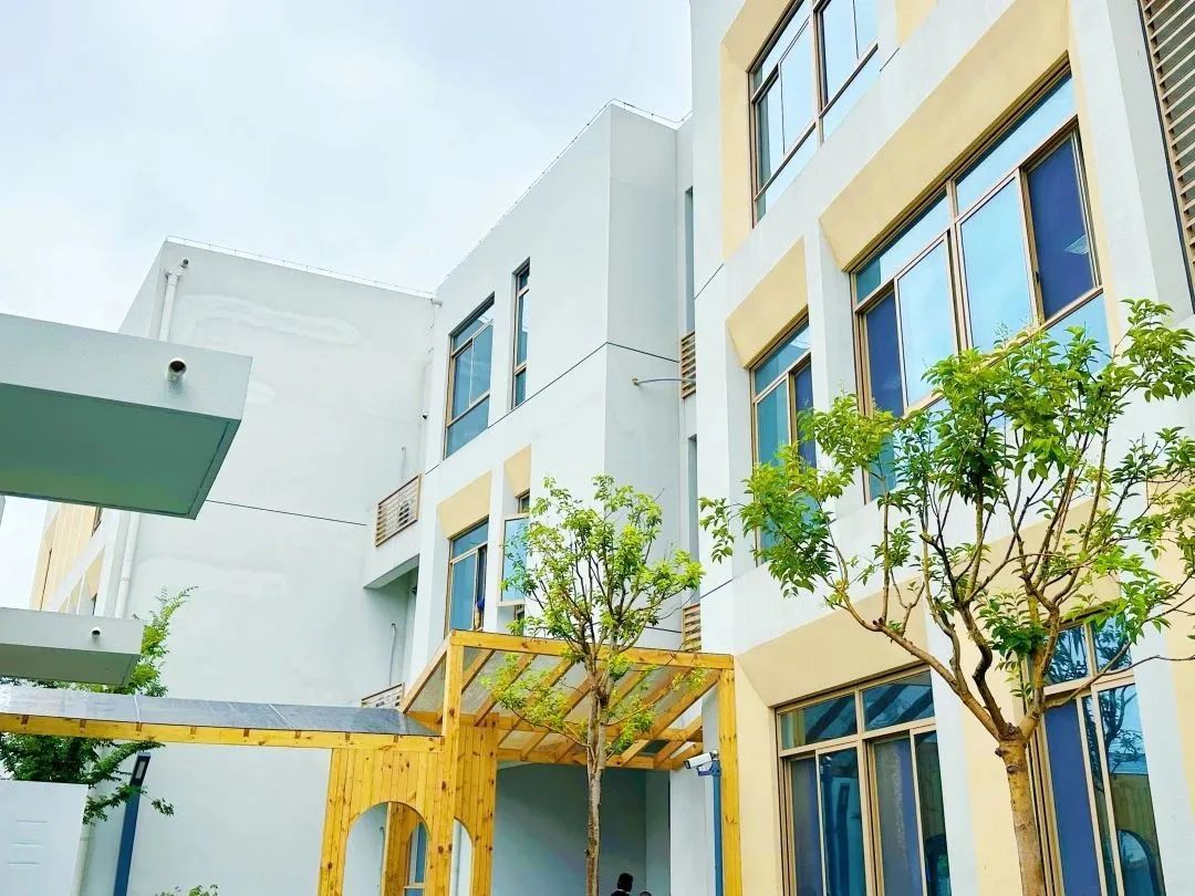 户外活动区和教学楼相互呼应,柔软的草皮、郁郁葱葱的草木生机盎然。