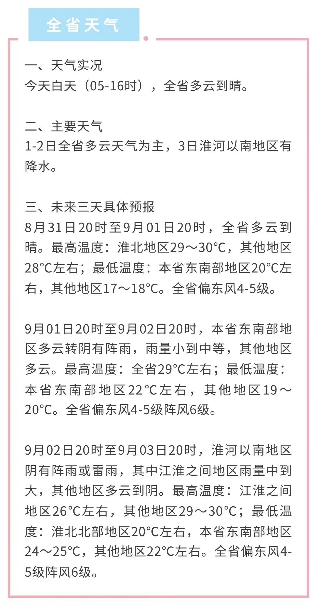 8月31日20时至9月01日20时,全省多云到晴。最高温度:淮北地区29~30℃,其他地区28℃左右;最低温度:本省东南部地区20℃左右,其他地区17~18℃。全省偏东风4-5级。