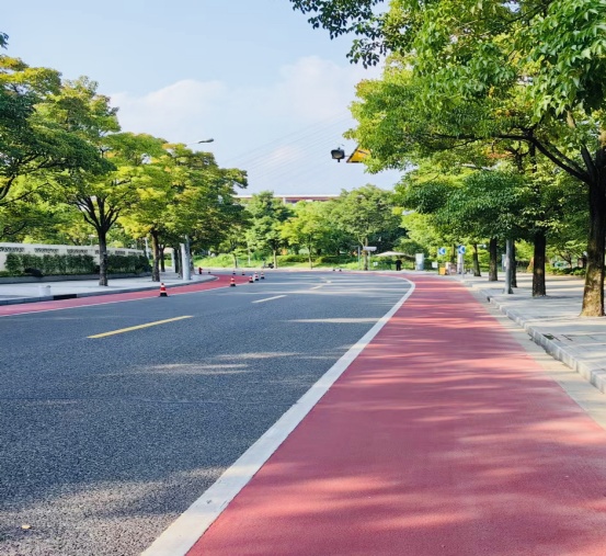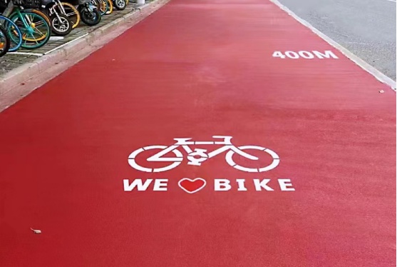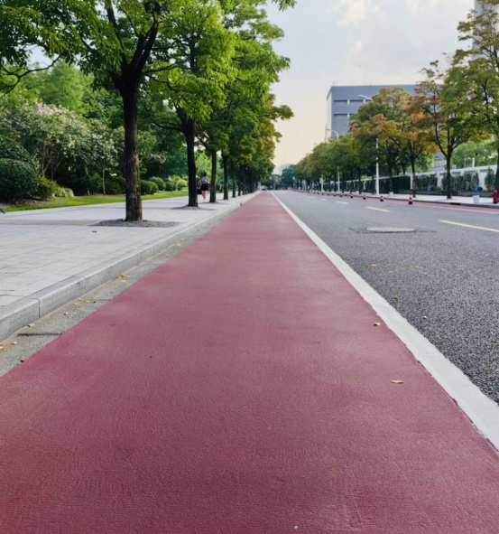 骑行道采用自主研发的低吸热水性纳米环保彩色材料,是一种兼具环境友好和使用功能的新型环保铺面材料,抗紫外线性能优异,使用寿命长,路面防滑测试BPN值不小于55,极端高温条件下可有效降低路表温度10℃以上。