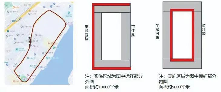 此次路面升级改造主要针对非机动车道,总长度有4-5公里,内圈起点在苗江路半淞园路路口,终点也回到这里,连成一个圆形;外圈则在马路对面,靠近滨江一侧,形成一个半圆。