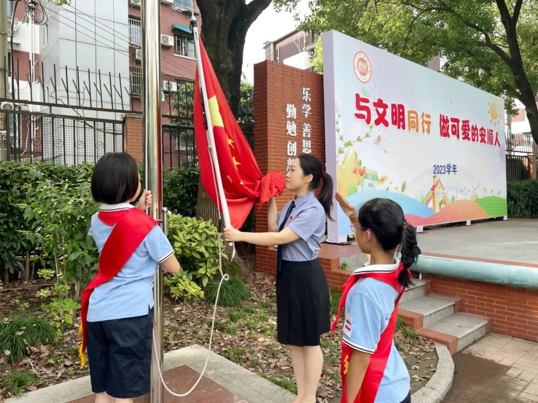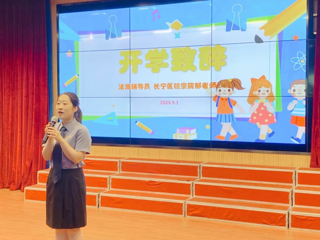 开学第一天,长宁区检察院第七检察部检察官助理郁郭馨前往安顺路小学开展开学法治“第一课”活动,在开学典礼暨升旗仪式上,以“守护少年的你”为主题为全校学生作开学致辞。