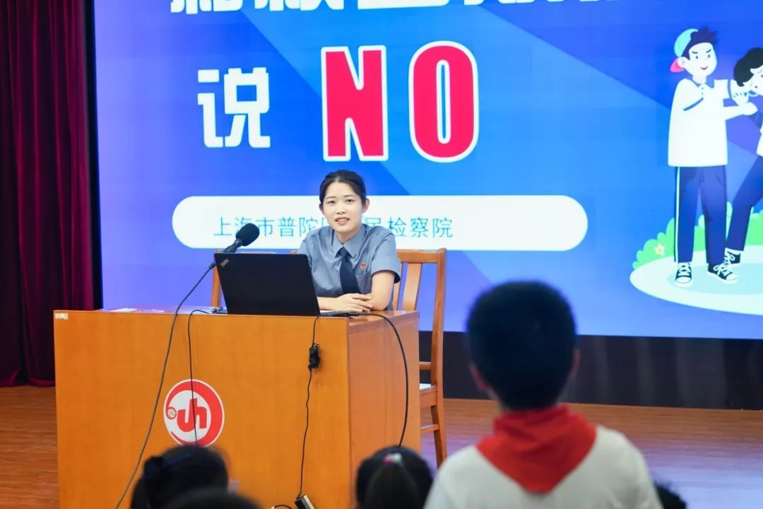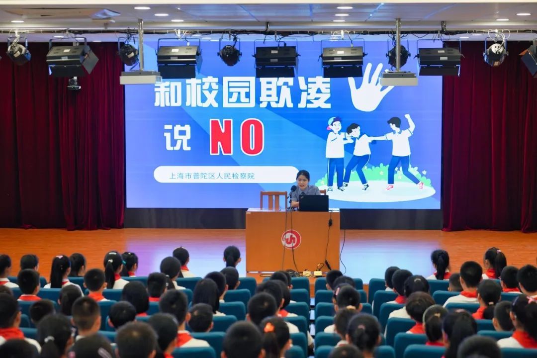 “校园霸王不能当,强拿硬要勿模仿,实施抢劫即构罪,称王称霸要判刑。”“遇上麻烦不慌张,保护自己最重要,巧妙取证留证据,寻求帮助不退缩!”8月31日,普陀区检察院第一检察部检察官助理李宜前往上海华东师范大学附属进华中学,以“和学生欺凌说‘NO’”为主题,为该校的300多名初中预备班新生送上法治宣讲第一课。