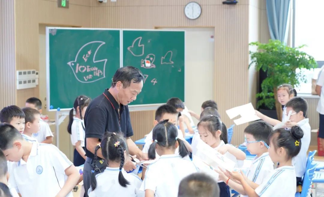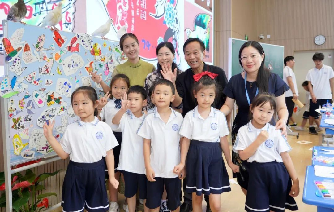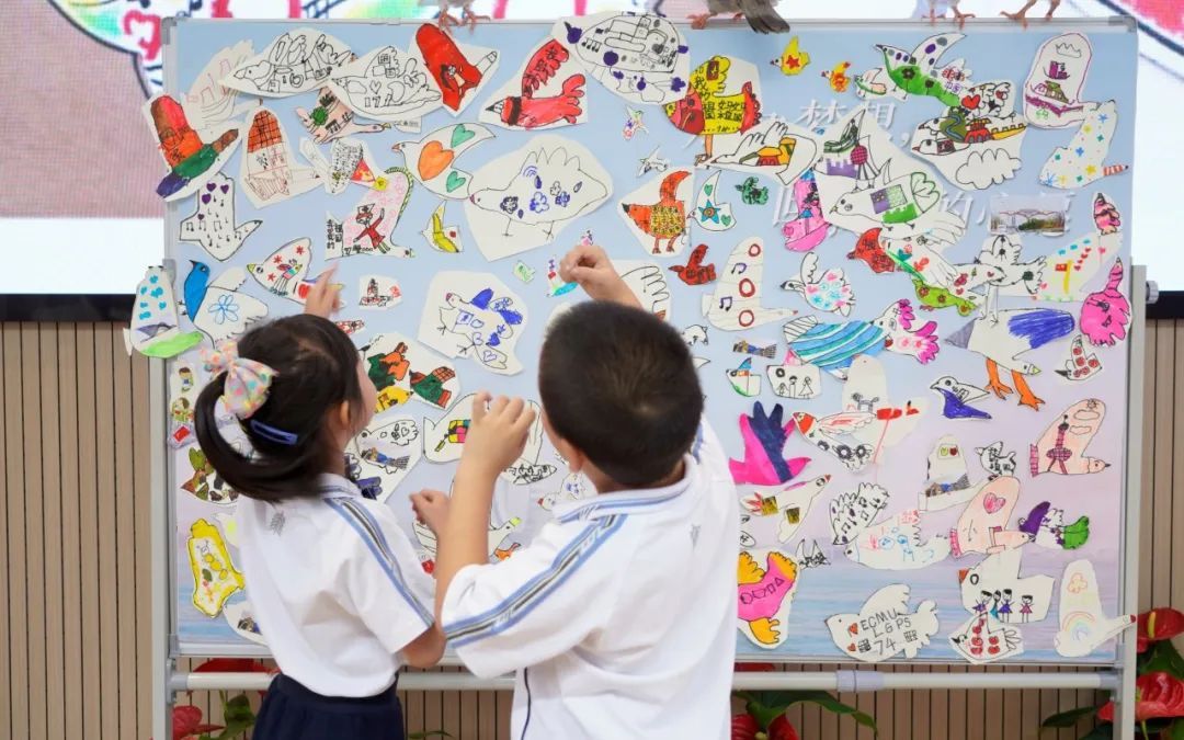 创作环节,瞿老师在黑板上的鸽子身上写上英文字母I❥ECNU(LGPS),代表着鸽子放飞华师大临港附小的教育梦想,飞向蓝天,把更好的教育洒向学生。他用国旗卡片装饰鸽子,又告诉孩子们即将来到的国庆节,激发孩子们的爱国热情。