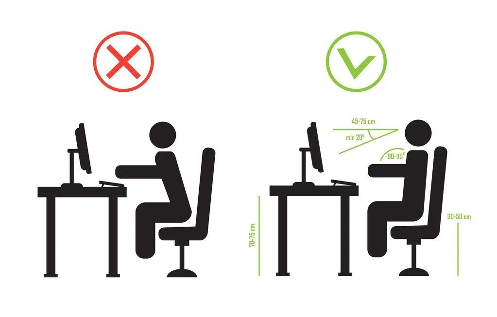 正确的坐姿:将电脑屏幕放置在与视线相等的高度,以保持颈部的直立,同时腰部保持直立,双足自然平放于地面。