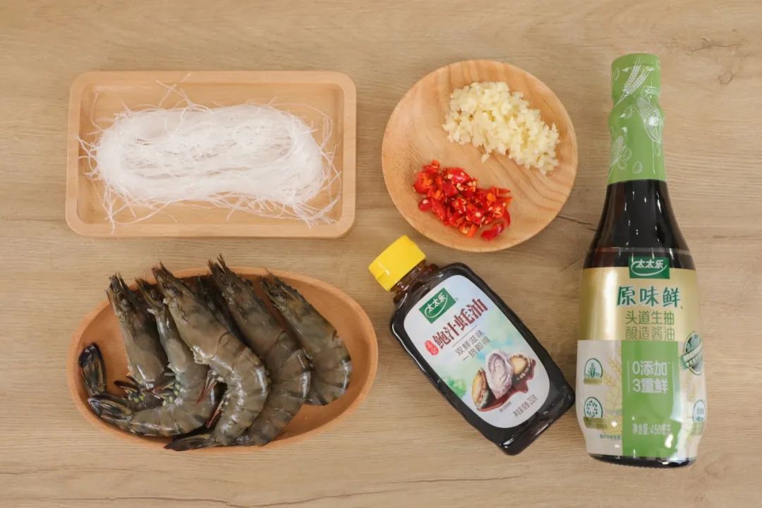 黑虎虾250克、粉丝50克、蒜蓉30克、小米椒5克、鲍汁蚝油15克、原味鲜生抽10克、白糖3克、三鲜鸡精3克、食用油50克。