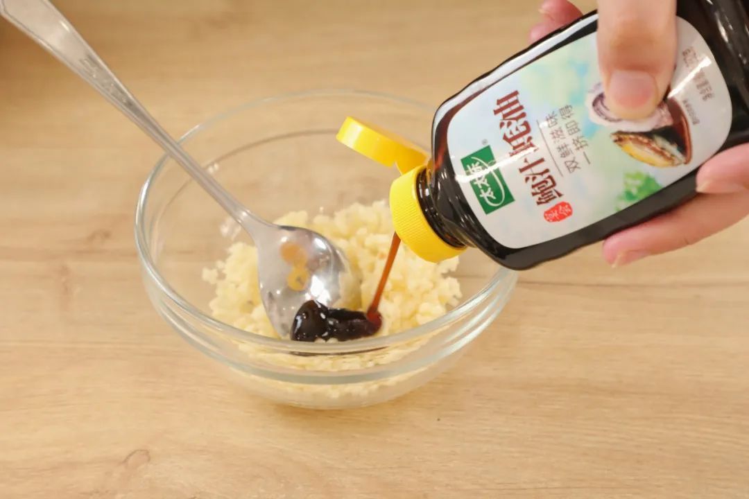 2.蒜蓉、小米椒放入碗中,加入鲍汁蚝油、原味鲜生抽、三鲜鸡精、白糖后拌匀,食用油烧热后浇入碗中,激发出蒜蓉和小米椒的香气。
