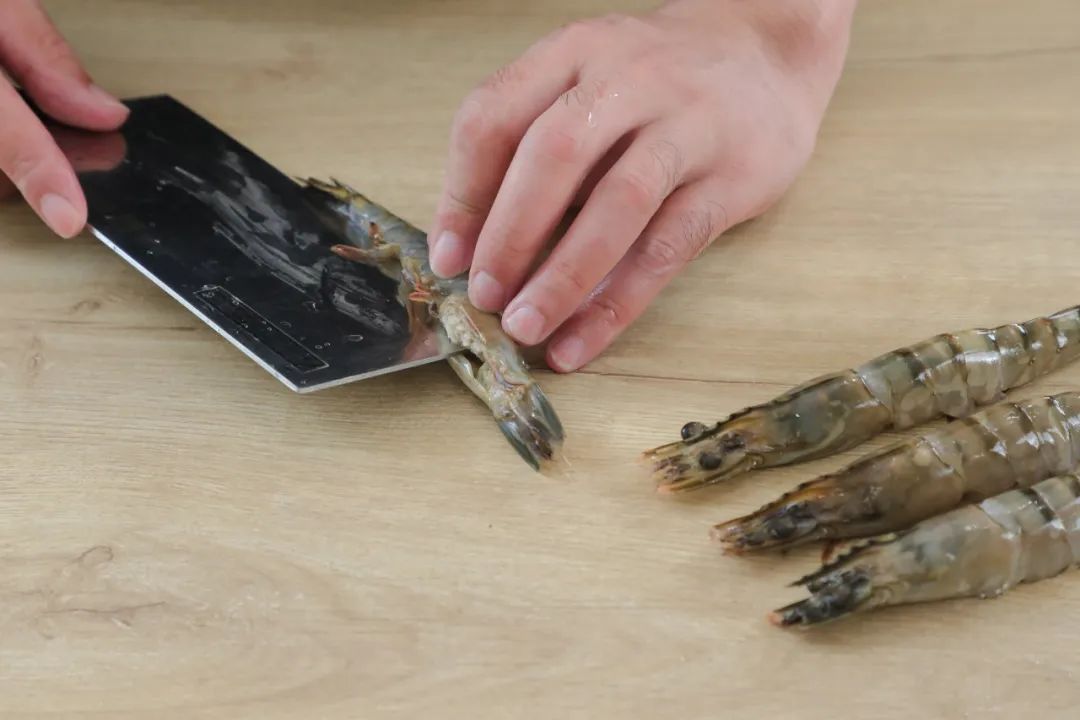 1.黑虎虾解冻后,在虾肚子处剖开。