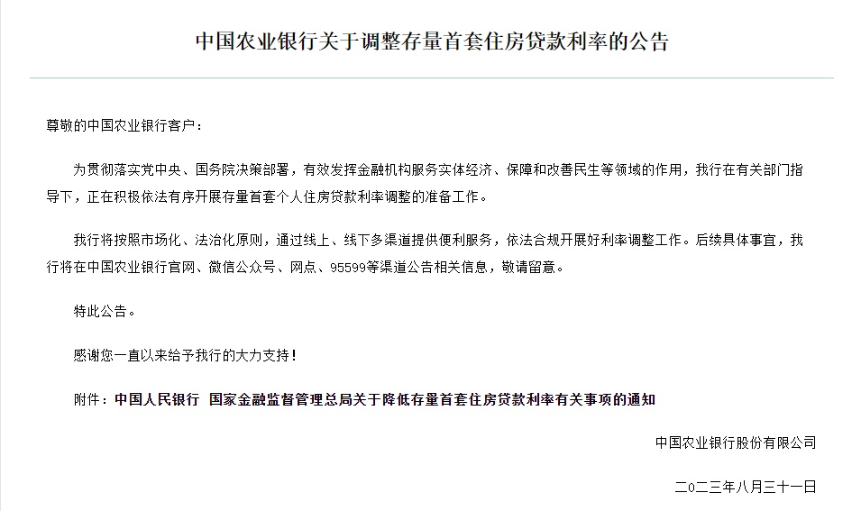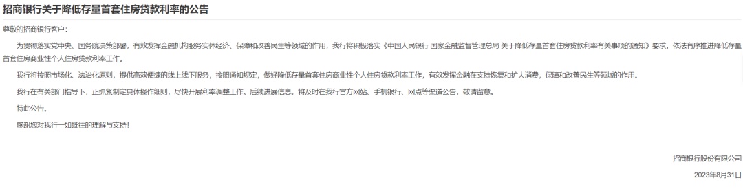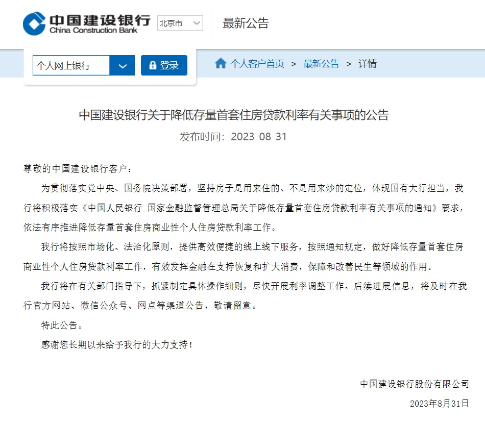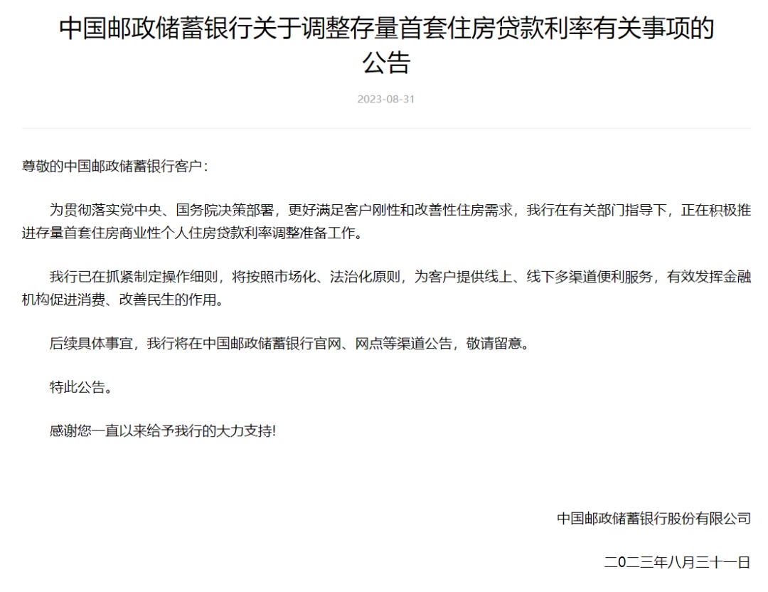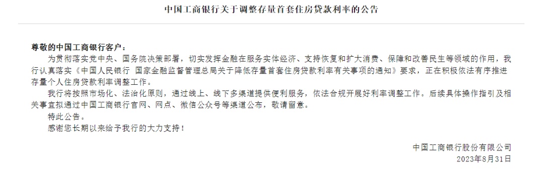 8月31日晚,就调整存量首套住房贷款利率,中国工商银行、中国建设银行、招商银行、中国邮政储蓄银行等发布公告。