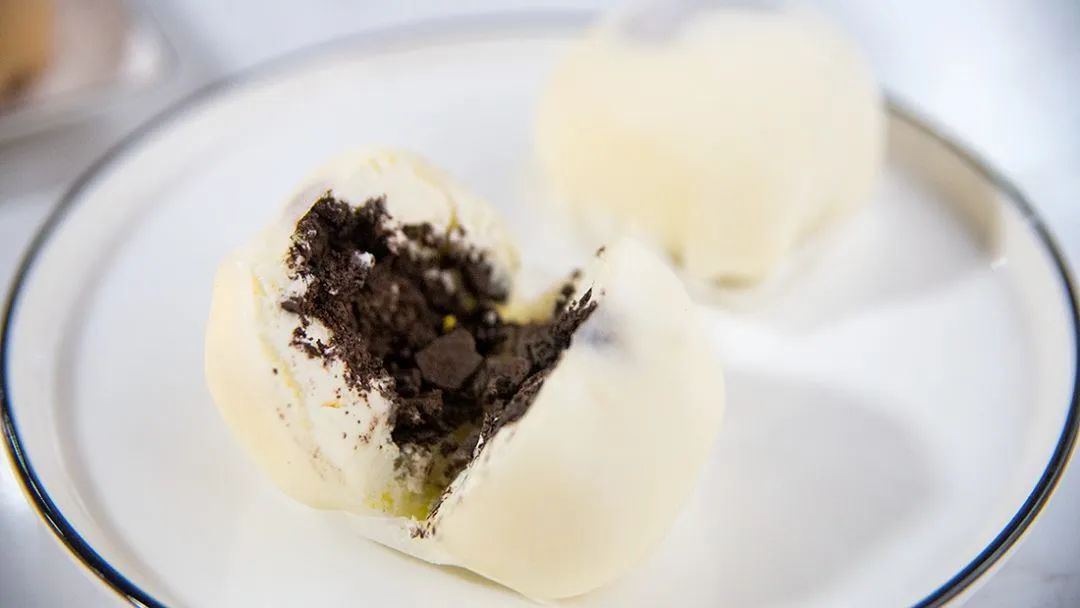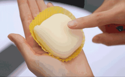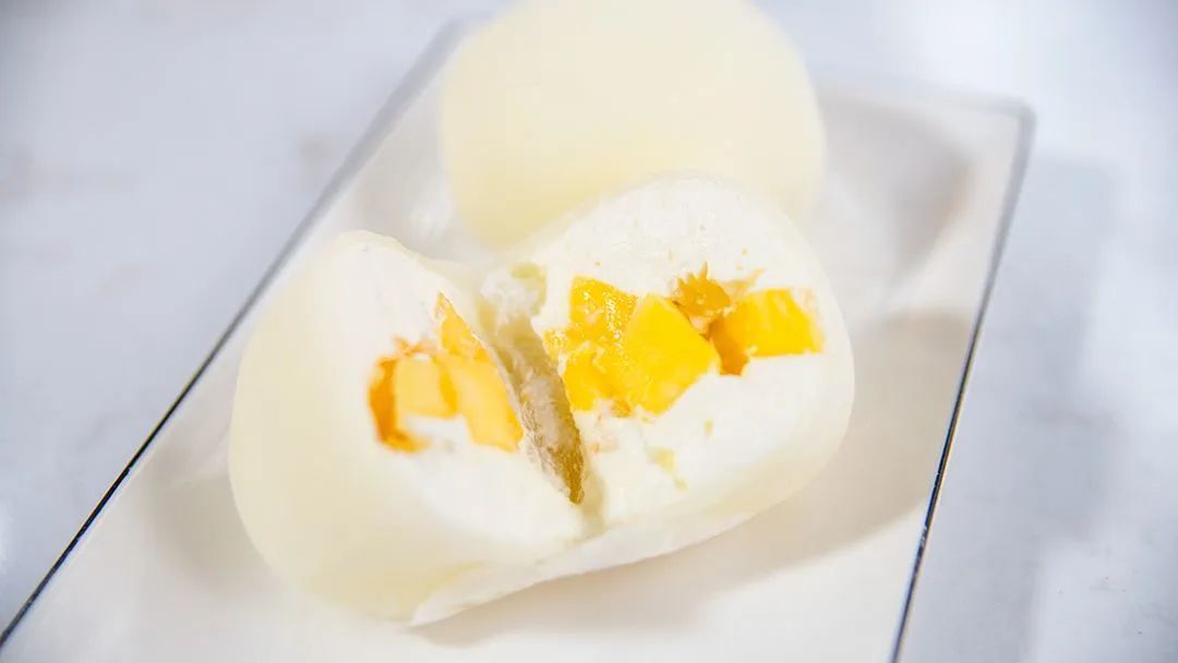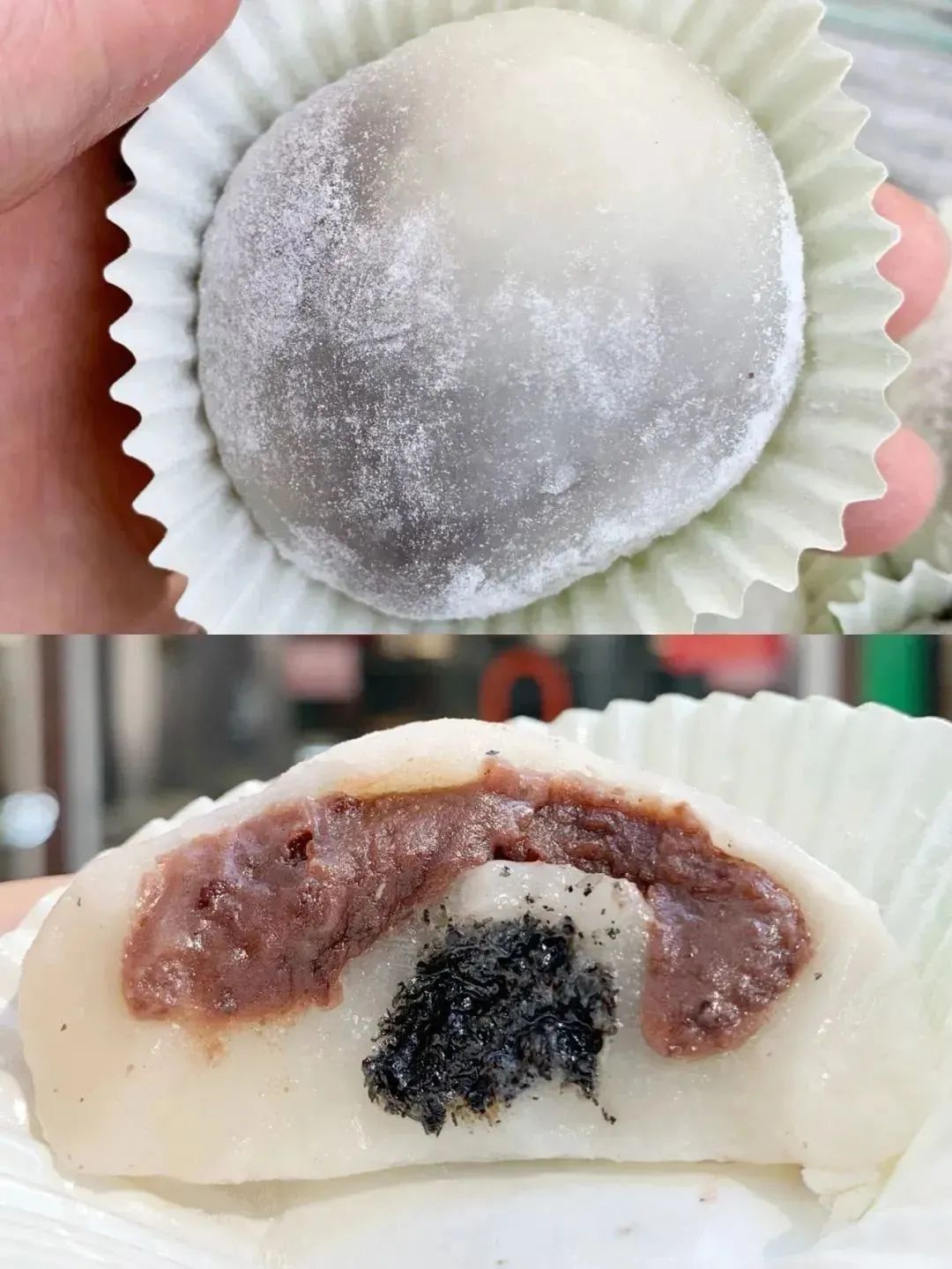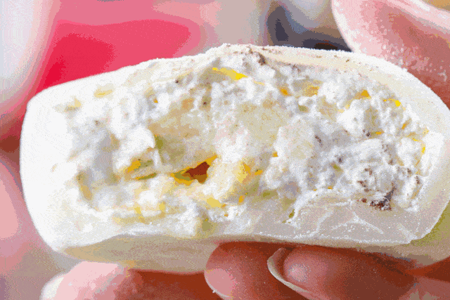 一整只雪媚娘捧在手中沉甸甸的,轻轻戳开表面的一层富有弹性而轻薄无比的糯米皮,里面包裹了满满香甜的奶油与果肉内馅,咬上一口超满足!