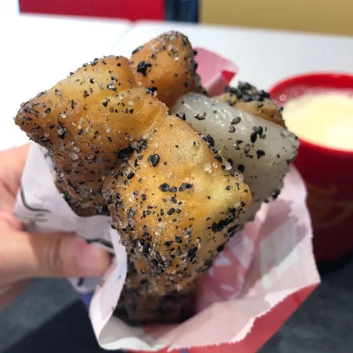油条和麻糍的网红搭配,大家都尝试过了吗?内里糯糯唧唧,还会拉丝!外酥里嫩,中间厚厚一层麻滋糯糯的,一整根大油条中间包括四周裹上白糖芝麻,真的很有分量。
