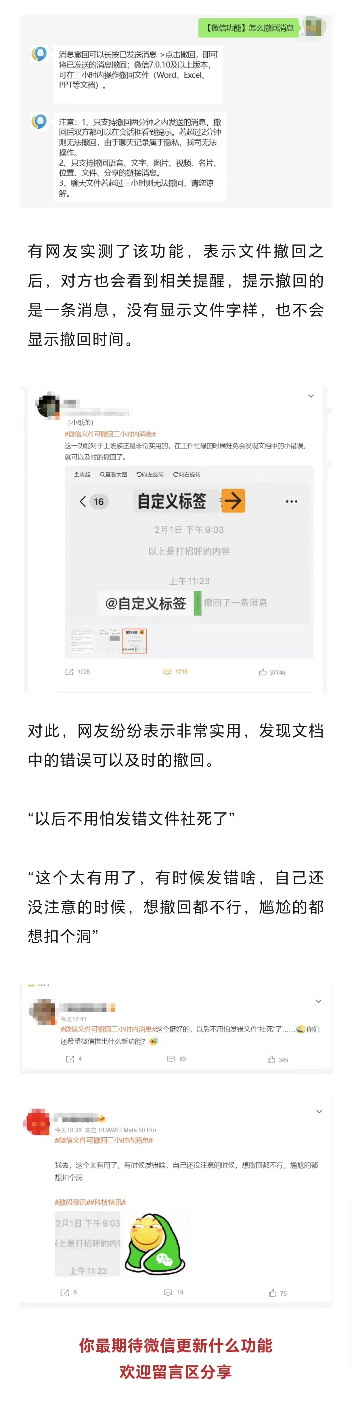 对此,腾讯客服向记者回应称:“微信7.0.10及以上版本可在三小时内操作撤回文件,包括Word、Excel、PPT。此外只支持撤回两分钟之内发送的消息,撤回后双方都可看到提示。”