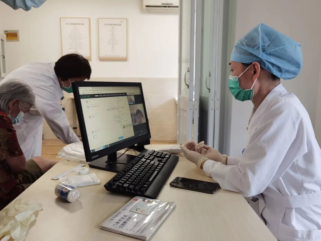 同样情况也发生在有静脉导管维护需求的案例中。王阿姨因腹部肿瘤术后2年中,每月到离家较近的医院进行输液港定期维护。随着病情的发展,患者腹部肿胀严重至卧床不起,原本想放弃维护的她,一次偶然机会得知枫林街道社区卫生服务中心也有输液港维护,于是家属来到社区站点进行咨询。在了解患者实际情况后,站点护士向中心静脉导管维护专科护理发出了会诊申请,专科护士接到申请后随即上门对患者进行评估,随之开启了输液港维护工作。患者家属表示,有社区专科护士上门服务极大解决了他们出行就诊的难题,看着相同的耗材和社区护士专业熟练的操作,对于自己的选择感到非常庆幸。