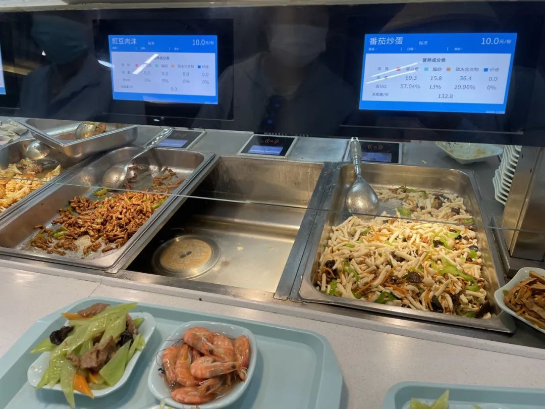 橱窗内菜品丰富,每个餐盘上方都用电子显示屏标出了菜名、对应价格和营养成分表,可谓周到。几十种菜品荤素皆备,为了更加贴合老年人的口味,整体菜色少油、少盐,形成了较为清爽和健康的菜品搭配。此外,小菜价格设定合理,一般一份素菜均价10元左右,大荤15~20元。社区食堂为周边居民省去日常买汰烧的烦恼,又可以保证一日三餐顿顿吃得热乎。因此,平时以为老助餐为初衷的社区食堂,也吸引了附近的户外工作者、外卖小哥、多口之家前来用餐。