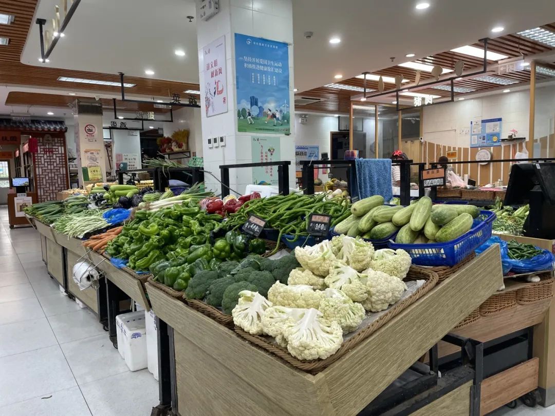 吃完了简单健康的午餐,不出5分钟路程,宏润社区市集便近在眼前。正可谓“麻雀虽小,五脏俱全”,社区市集面积不大,但摊位设置完整丰富,动线设计合理,整体环境干净整洁。居民可以在这里一站式买到各类熟食、蔬果、肉类、半成品、豆制品,甚至鲜花和云南特产。门口侧边墙上还有整个市集的区域导览,方便居民快速找到对应窗口。