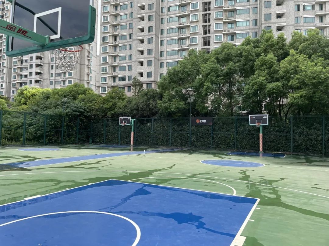 再往前走几步,看到漕溪支河的路牌拐弯进去,便是一个设施完备的篮球场。宏北市民球场可通过微信小程序预约使用,每小时5元,在这样的地段,这个价位可算是超级优惠了。侧边还有健身器材和棋桌,可谓考虑全面。