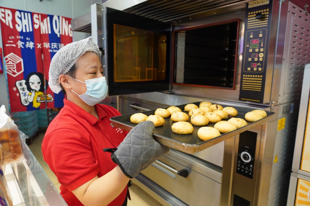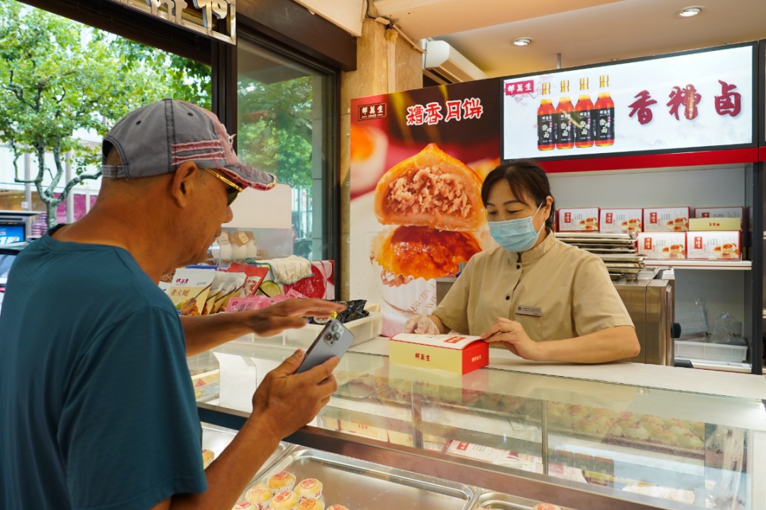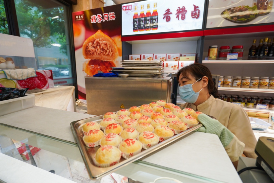 位于徐汇区淮海中路1000号的上海第二食品汇聚了不少沪上老字号品牌,开设在沿街口位置的邵万生最先吸引消费者。而现烤鲜肉月饼则是实实在在俘获了“上海胃”,市民张先生每年在中秋前就特意前来选购,这次在店员的推荐下,买了邵万生的新品糟香月饼。