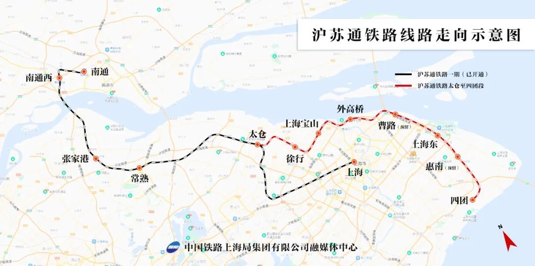 沪苏通铁路太仓至四团段位于苏南和上海沿江、沿海地区,北起沪苏通铁路太仓站,南接上海市浦东铁路四团站,途经江苏省苏州市所辖的太仓市及上海市嘉定区、宝山区、浦东新区和奉贤区。线路全长111.8公里,设计时速200公里,全线设太仓、徐行、上海宝山、外高桥、上海东、四团站,预留曹路站、惠南站。该项目采用客货共线的运输组织模式,其中江苏省境内长7.3公里,上海市境内长104.5公里,工程的先行段已于2019年底开工建设。