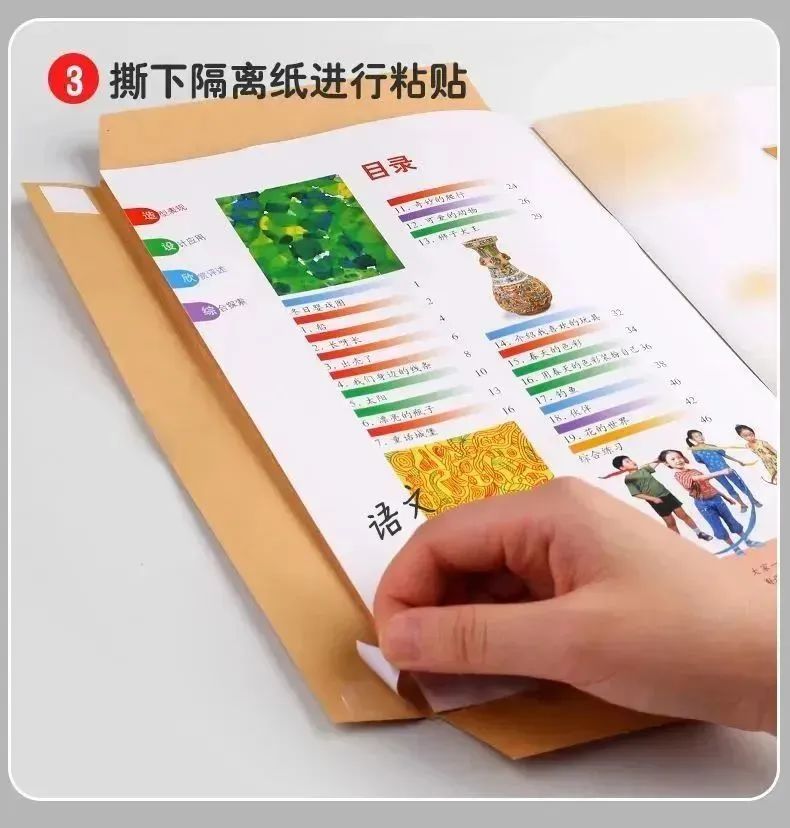 只需将书皮沿着书边缘撕下来,然后将书皮塞进去,就大功告成!