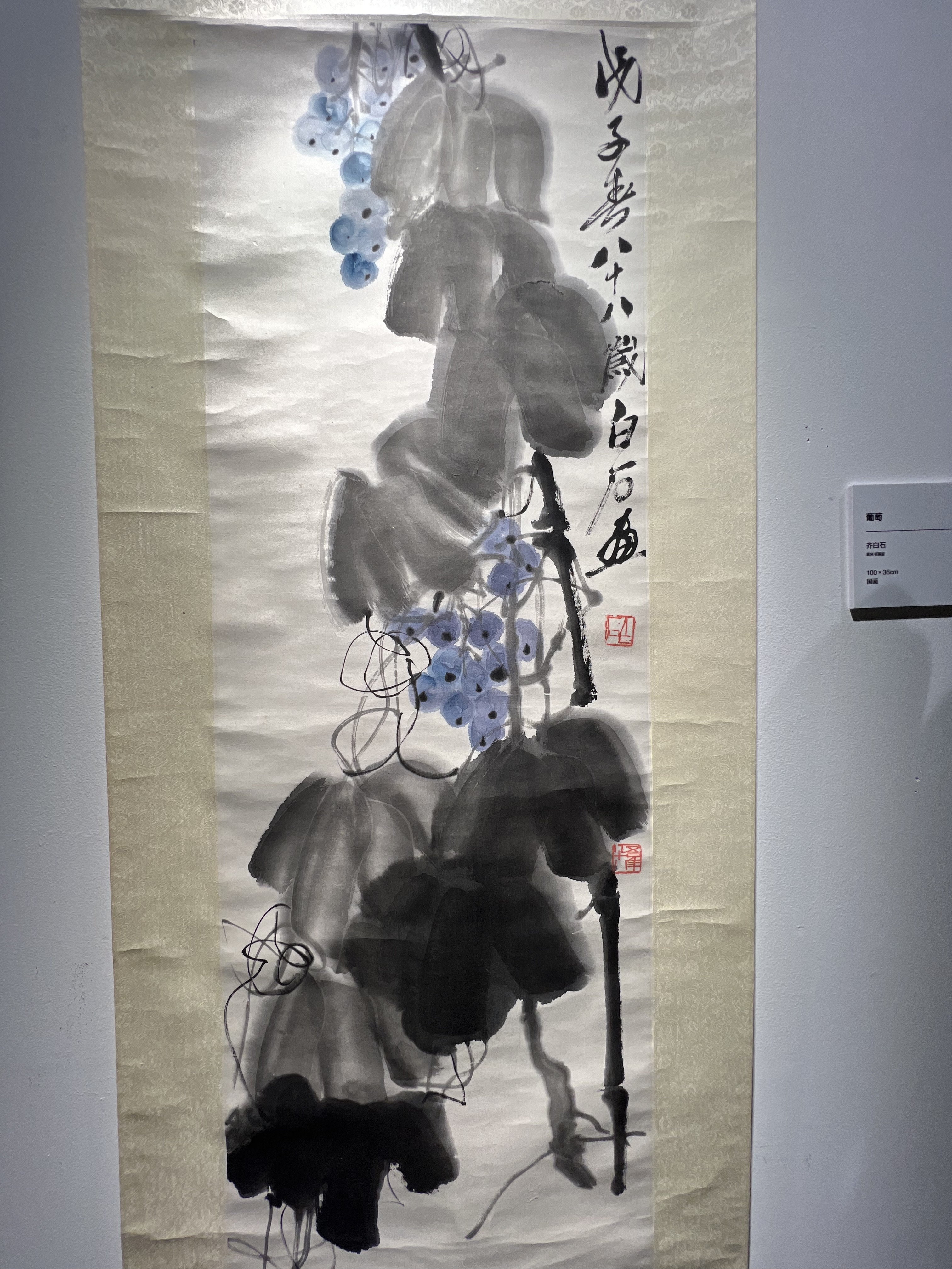 “虽然看起来这幅画仅仅是寥寥数笔很简单的绘画作品,但是可以品读到作者常年累月、刚柔兼济的绘画功底。”宣家鑫在介绍齐白石《葡萄图》感慨到,作品充满了浓郁的乡土意蕴,齐白石老人常画葡萄,葡萄籽多,因而寓意“多子多福”,画面呈现了明朗乐观的格调。