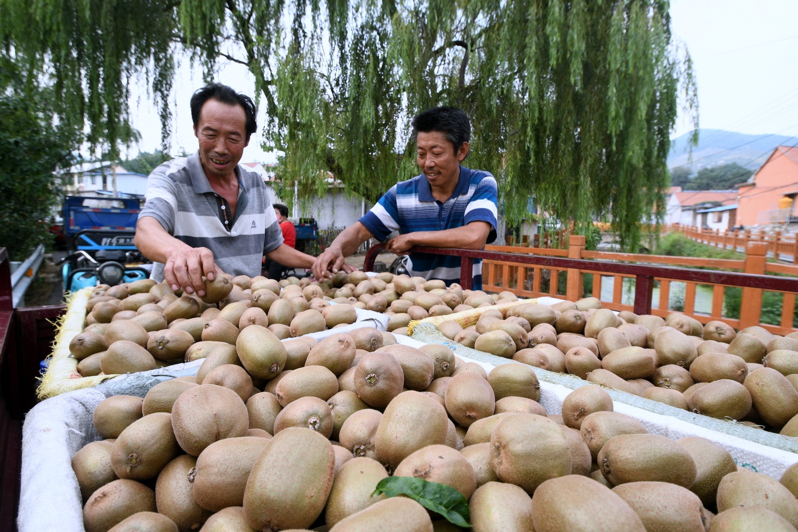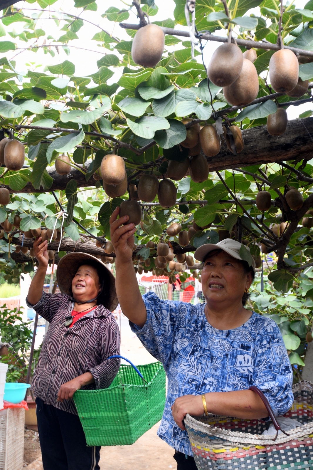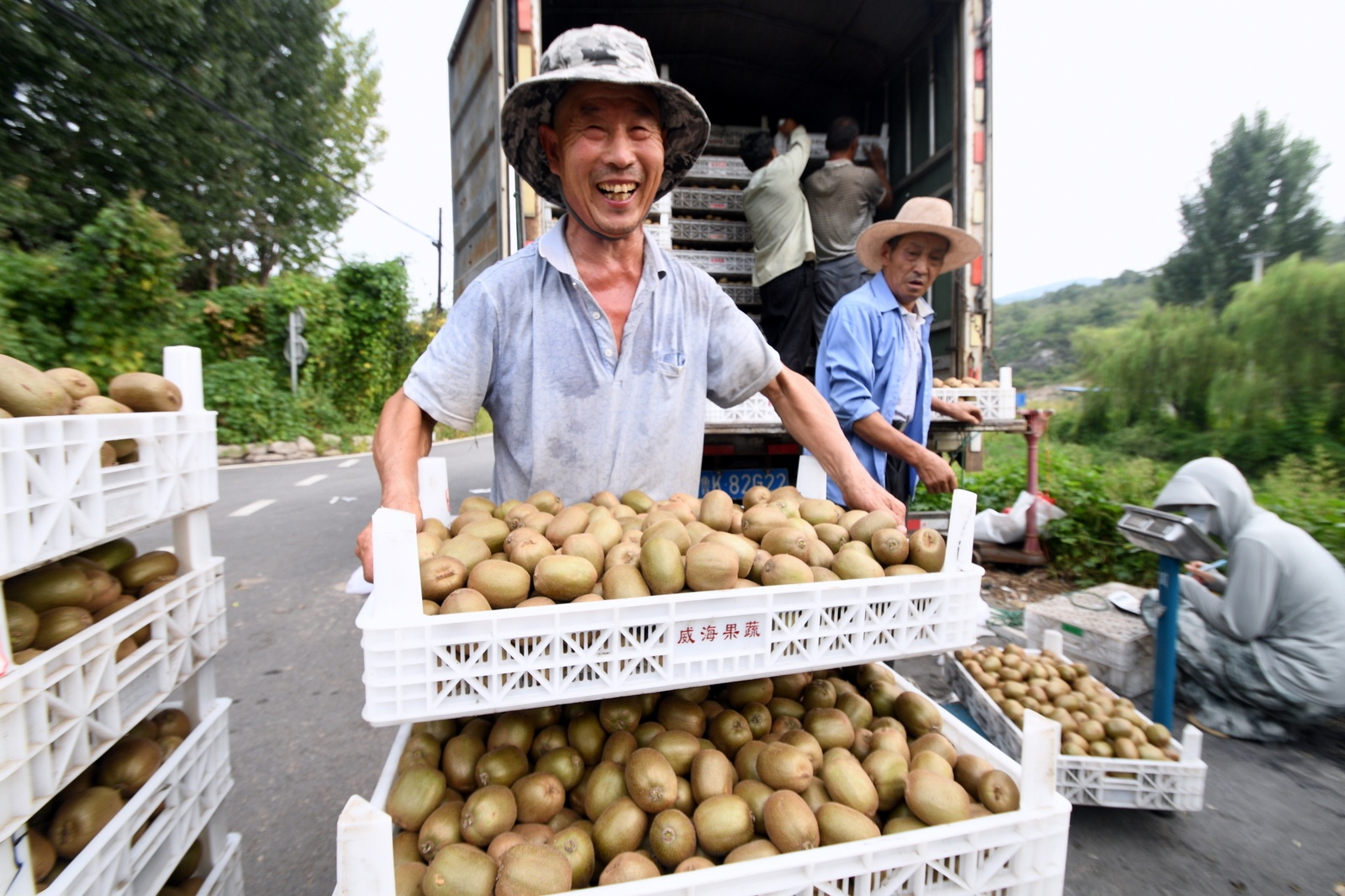 9月4日,在沂源县南鲁山镇璞邱村猕猴桃基地里,人们正在采摘成熟的猕猴桃。在茨峪村头,收购猕猴桃的客商忙得不亦乐乎。眼下,沂源县南鲁山镇的猕猴桃相继成熟,果农忙着采摘熟果,客商、快递公司忙着联系业务,到处一派繁忙景象。近年来,南鲁山镇充分发挥该地地势高、昼夜温差大、水果糖分高的优势,大力发展猕猴桃等果品种植,建立“公司+农户”的生产经营模式,其中猕猴桃栽培面积达3000多亩,带动了群众增收致富。(大众日报客户端记者 刘宪伟 通讯员 陈作进 报道)