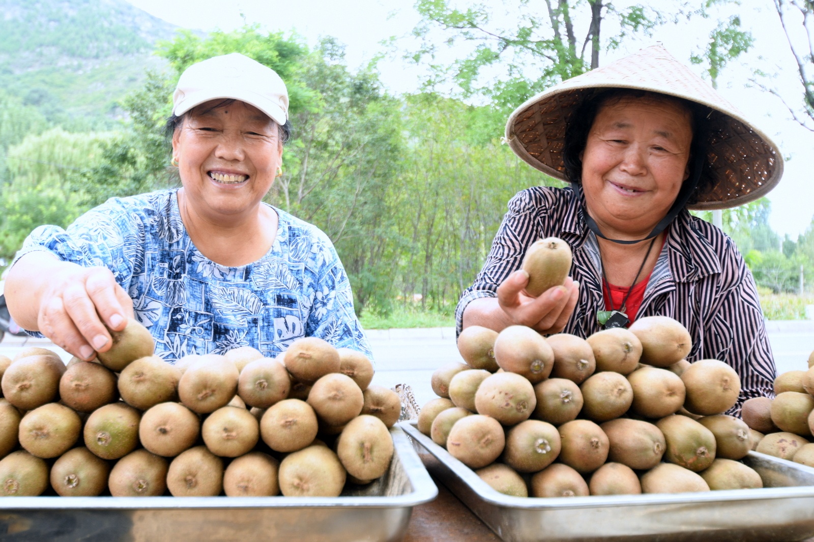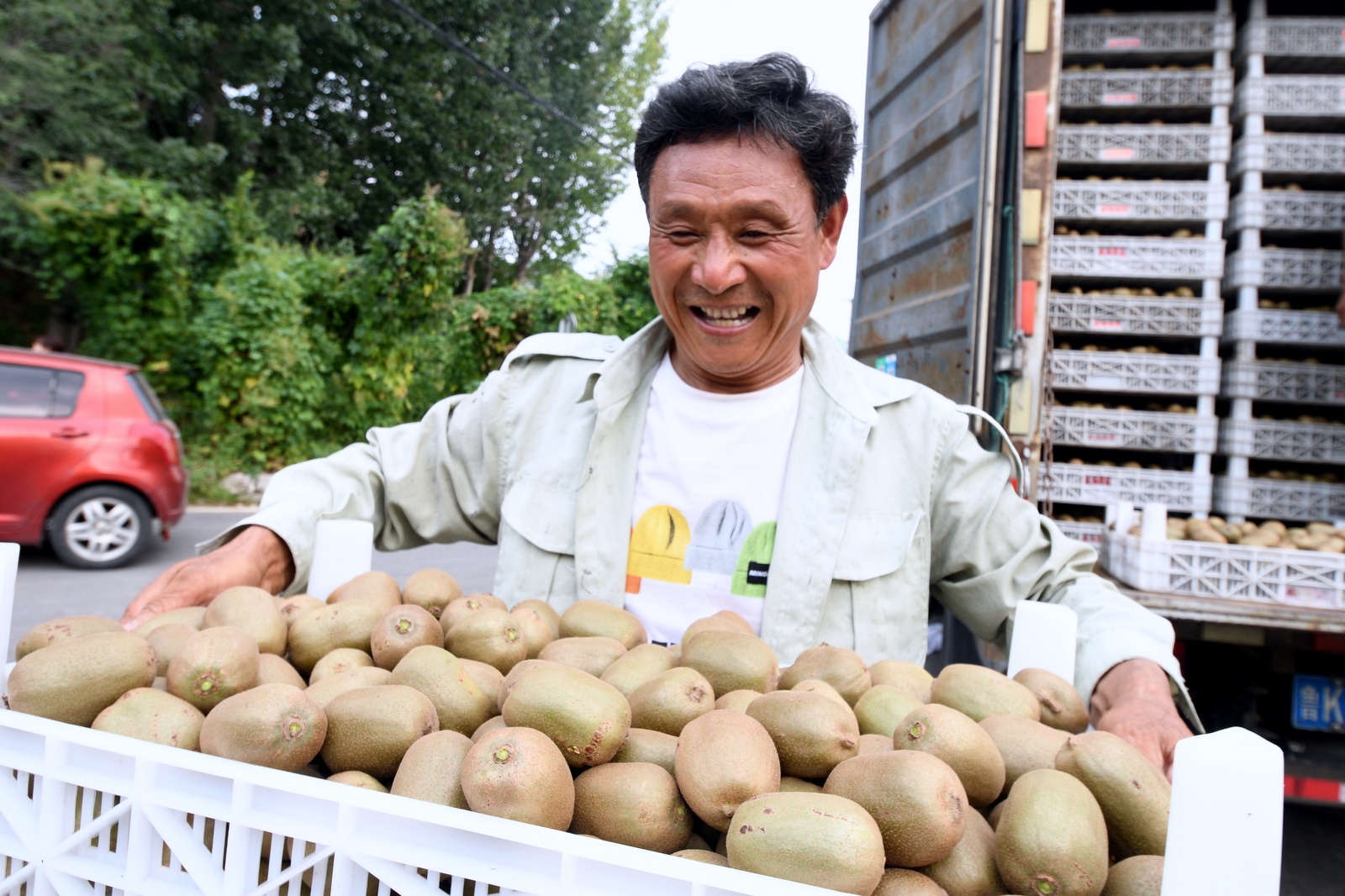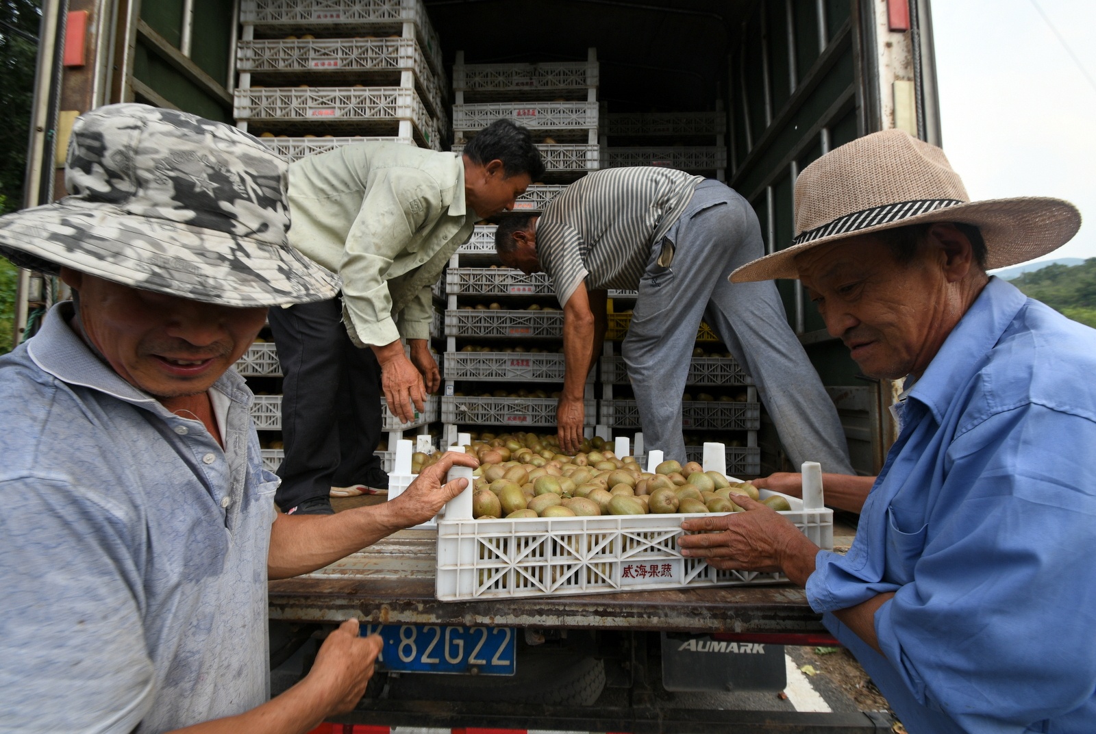 9月4日,在沂源县南鲁山镇璞邱村猕猴桃基地里,人们正在采摘成熟的猕猴桃。在茨峪村头,收购猕猴桃的客商忙得不亦乐乎。眼下,沂源县南鲁山镇的猕猴桃相继成熟,果农忙着采摘熟果,客商、快递公司忙着联系业务,到处一派繁忙景象。近年来,南鲁山镇充分发挥该地地势高、昼夜温差大、水果糖分高的优势,大力发展猕猴桃等果品种植,建立“公司+农户”的生产经营模式,其中猕猴桃栽培面积达3000多亩,带动了群众增收致富。(大众日报客户端记者 刘宪伟 通讯员 陈作进 报道)