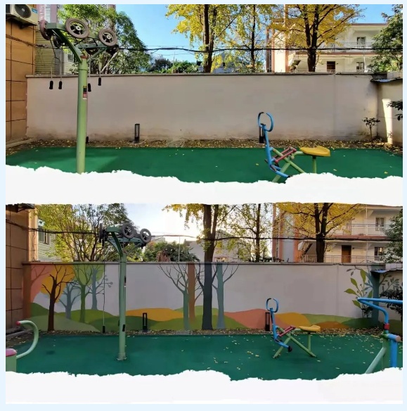最终,结合居民的构想,对小区的公共健身空间进行了周边墙面的彩绘改造;对2、4、6号楼的一层楼道墙面和外墙也进行了美化;同时,增添休息长椅,提升了公共健身区域的温馨感和空间美感。