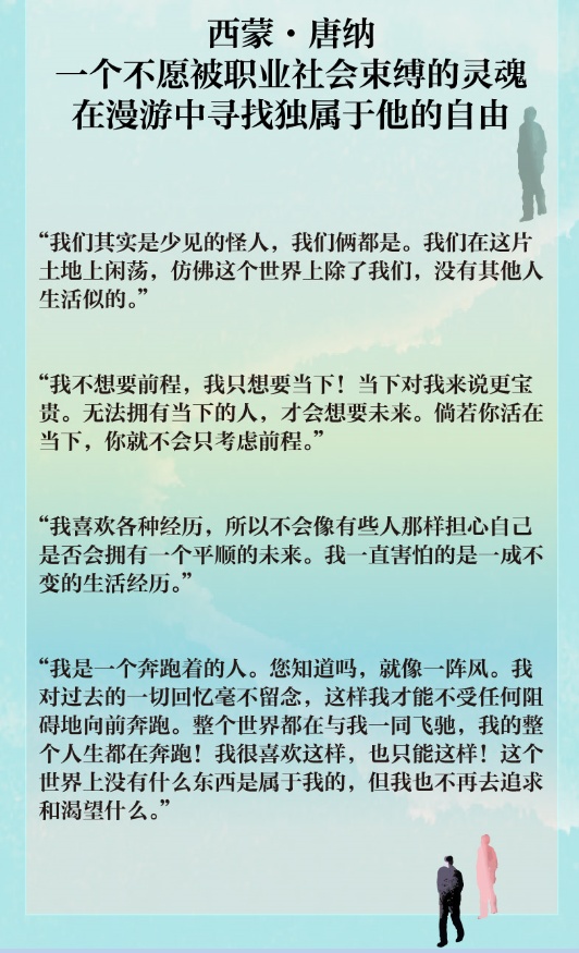 往后看整部小说,就会发现这个年轻人远不止如此,他的人生一直在漫游,不从事长期工作,也不需要假期。