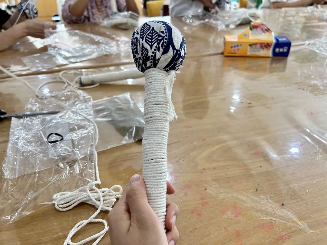 蓝色粗布、艾草粉末、锤柄、麻绳、橡皮筋……活动伊始,老师把制作材料逐一分发给大家,紧接又向大家普及了艾草锤的功效和作用。“制作好的艾草锤会散发着淡淡的艾草药香,有宁神理气、安神助眠、驱蚊驱虫的作用。用它轻轻敲打在身体的各个部位,可以疏通经络,加快人体的血液循环。”