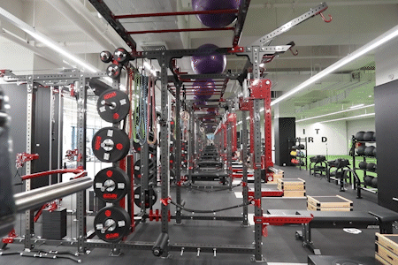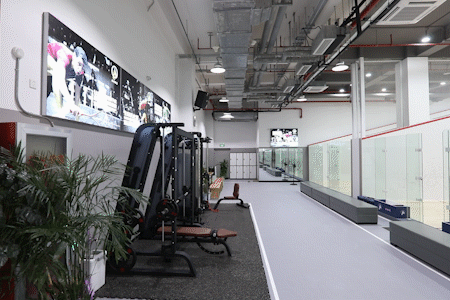 木星综合体能训练中心配有专业的体能训练设备,还有跑步机、训练力量的仪器等。最值得一提的是这里还有一个国家队训练器材,苏炳添的同款跑步训练器——数字气阻短跑训练器。