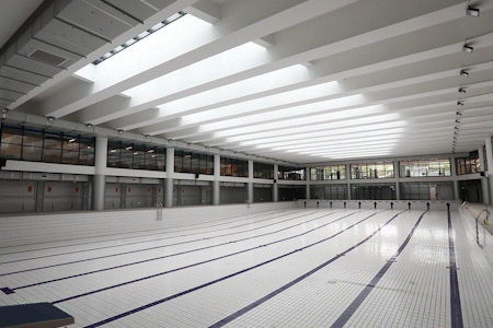 水星游泳馆是一个50米长的超大国际标准游泳池,一共有11根泳道,场内还另设一个儿童游泳馆。