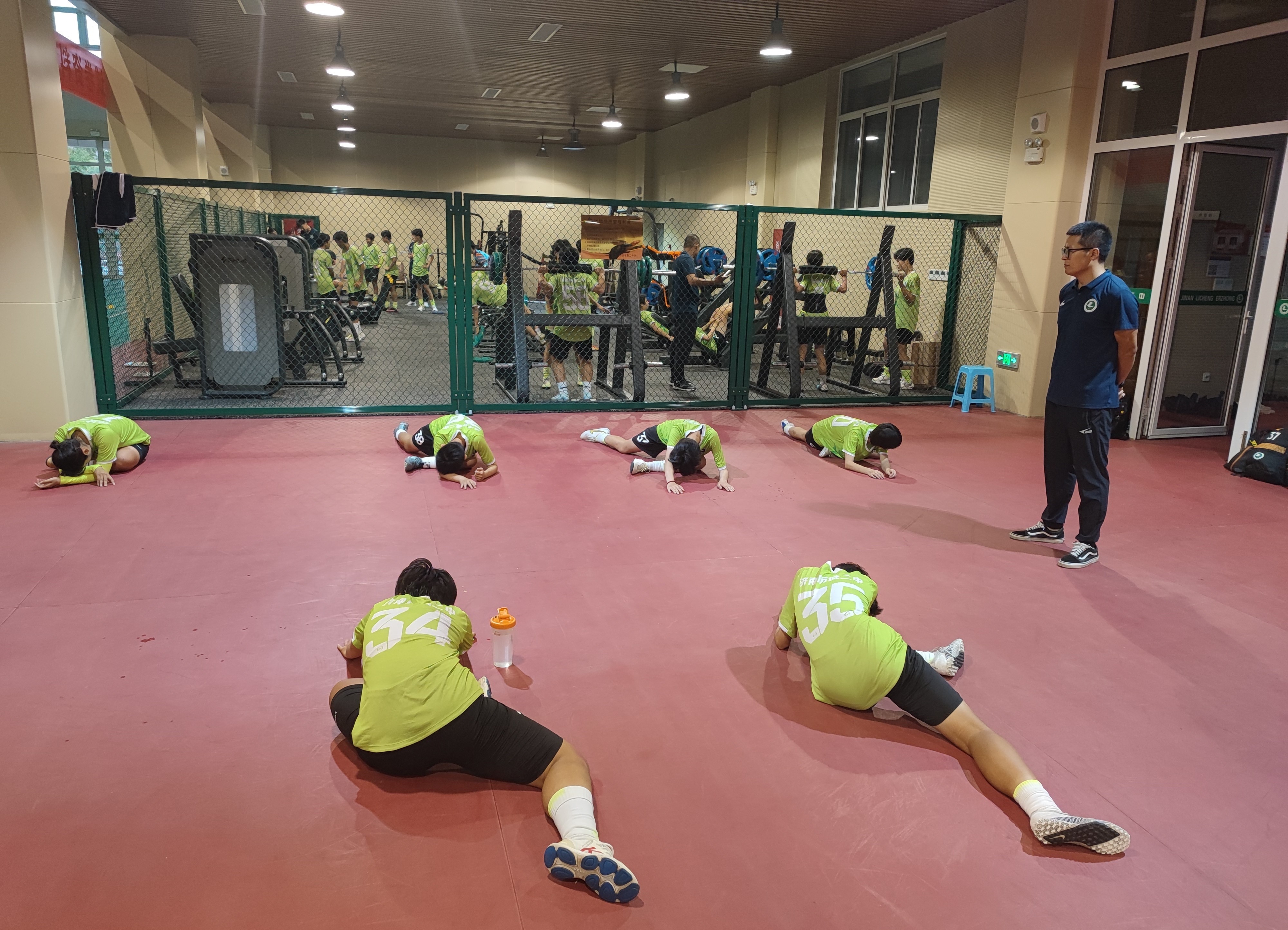 8月28日,记者第一次来到历城二中。下午4点,女足队员们陆陆续续提前来到体育馆,拉伸、压腿,各自进行训练前的热身,这是她们返校后的第一次力量训练。开学前,学校刚给训练器械下面铺上了新的地垫,踩上去很舒适。