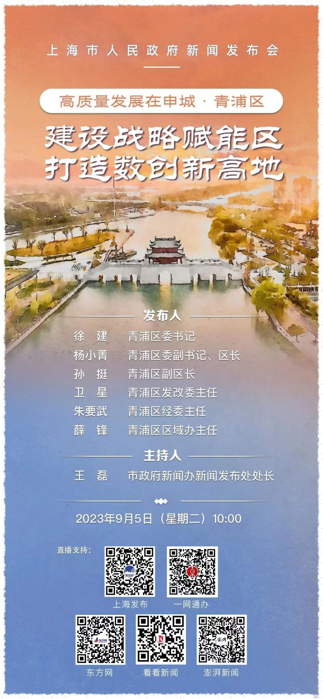 今天(9月5日)上午,市政府新闻办举行“高质量发展在申城”系列市政府新闻发布会第九场——“建设战略赋能区,打造数创新高地”青浦区专场。青浦区委书记徐建介绍青浦区推动经济社会高质量发展情况和工作举措,青浦区委副书记、区长杨小菁,青浦区委常委、副区长孙挺,青浦区发改委主任卫星,青浦区经委主任朱要武,青浦区区域办主任薛锋共同出席新闻发布会,并回答记者提问。