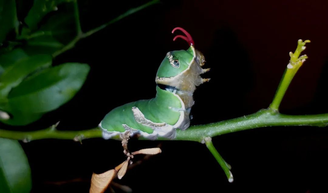 养玉带凤蝶的幼虫除了和养蚕一样可以围观它们啃树叶。偶尔还可以逗逗它们玩。比如轻轻摸摸它们的脑袋,它们就会觉得有人想害它们,然后就开始使用它们的秘密武器 -- 臭角防御,散发出“迷人的气味”。对的,这和宝可梦里绿毛虫的技能如出一辙!