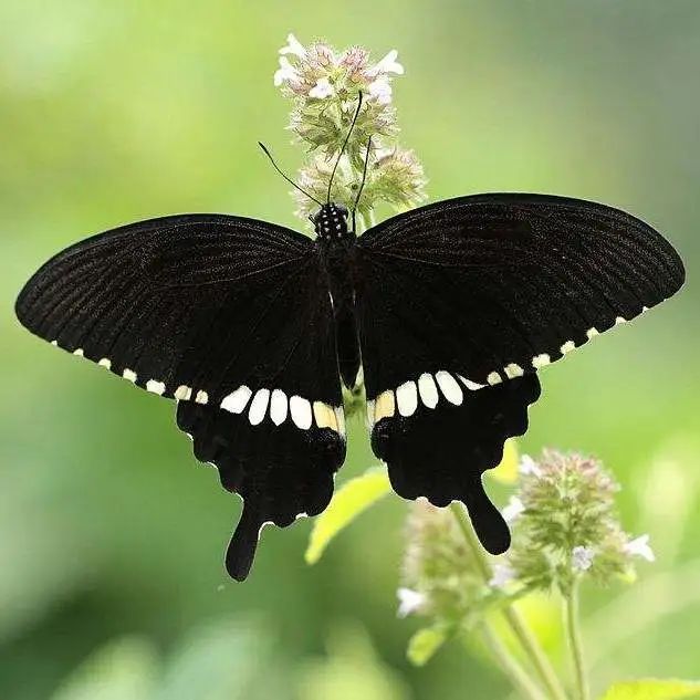 你肯定见过这种蝴蝶吧!雄蝶翅上有一行白色的斑点,宛如一条玉带。玉带凤蝶的名字也由此而来。玉带凤蝶在江浙地区极为常见,雌蝶与雌蝶常常成对跳舞,看似恩爱。坊间也因此传言梁祝所化的蝴蝶就是它们。