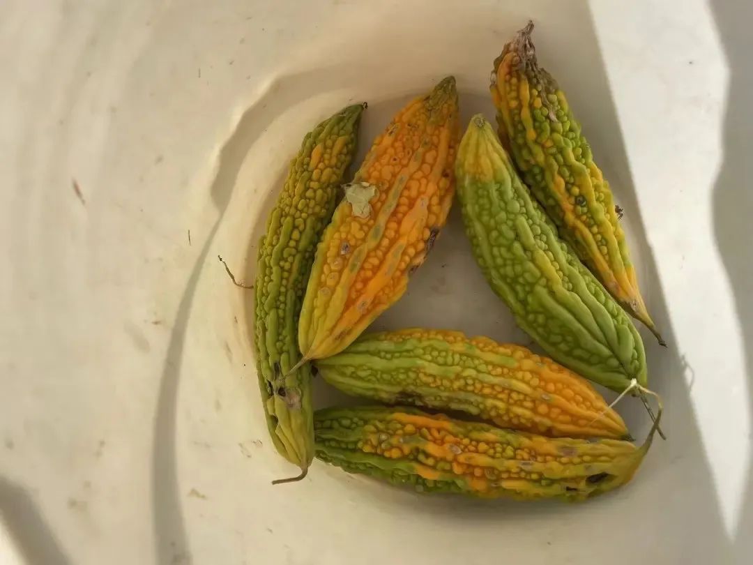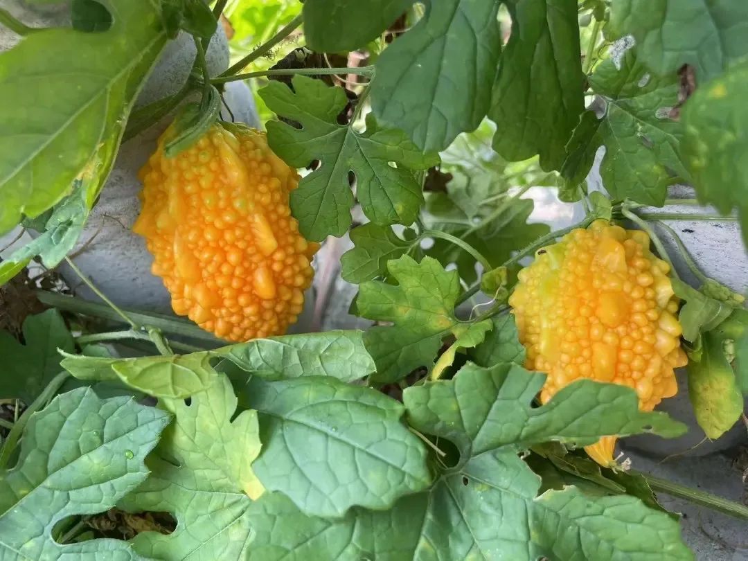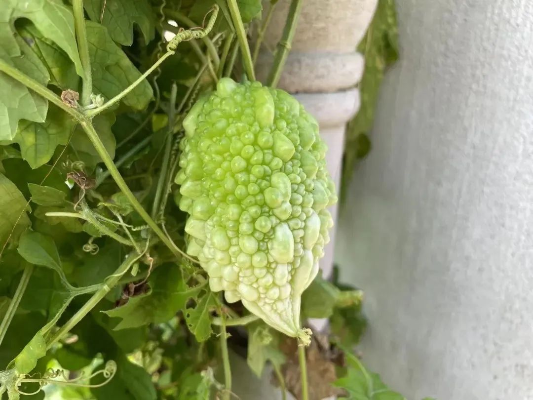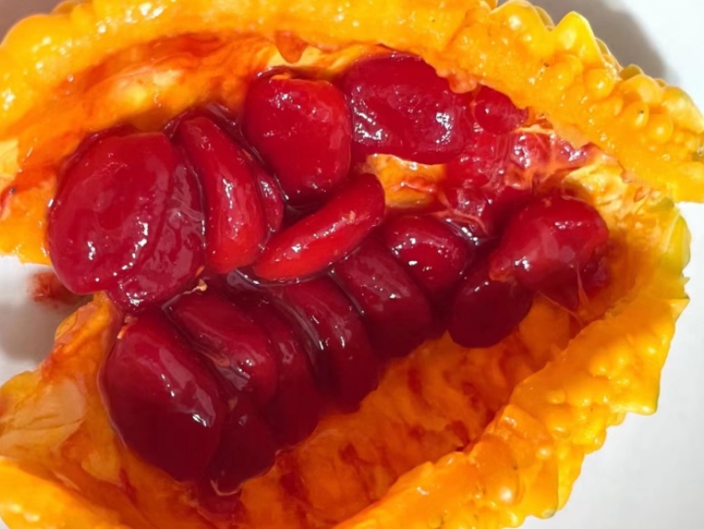 没错!左图就是金铃子,未成熟的状态就像颗绿宝石一样,右边则是我们常吃的苦瓜,这是苦瓜成熟后的状态,值得一提的是成熟后的苦瓜瓤也是红色的,据说尝起来和金铃子差不多哦!
