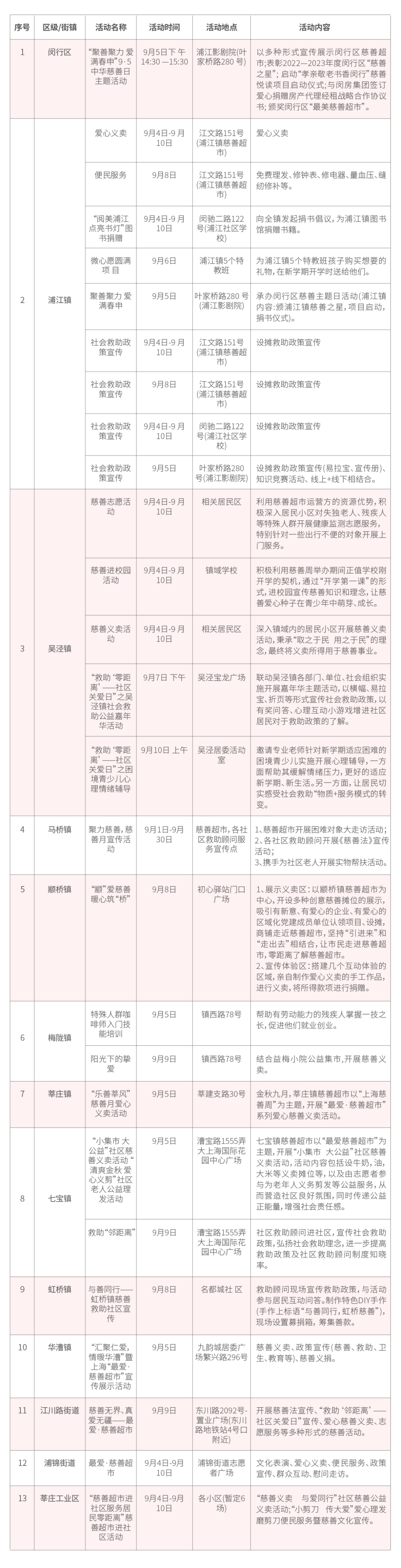 今年的9月4日—10日为“上海慈善周”,以“聚善聚力,共赴高质量发展”为主题,闵行区精心组织各类慈善活动,着力打造家门口的慈善盛会,进一步宣传慈善文化理念,推动慈善工作实践,在全区营造“人人可慈善,处处可慈善”的浓厚氛围。