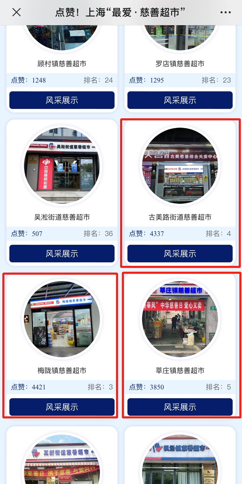 2. 下拉,找到闵行的3家慈善超市进行点赞。